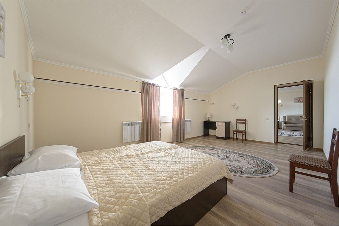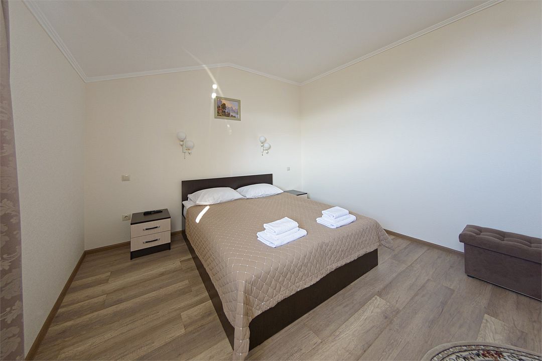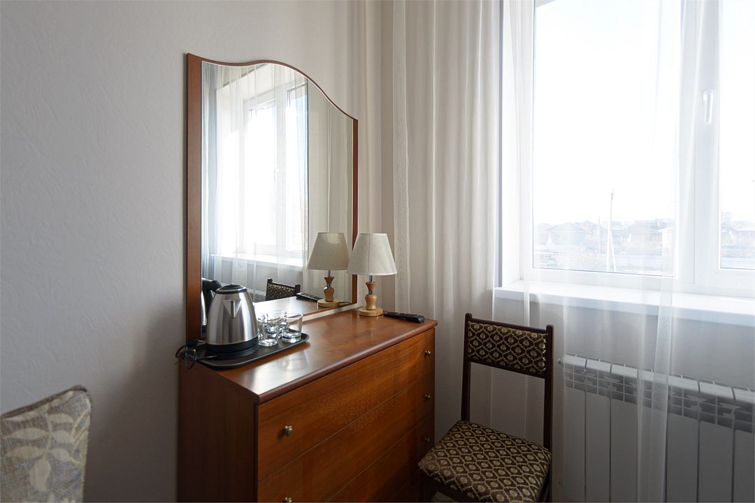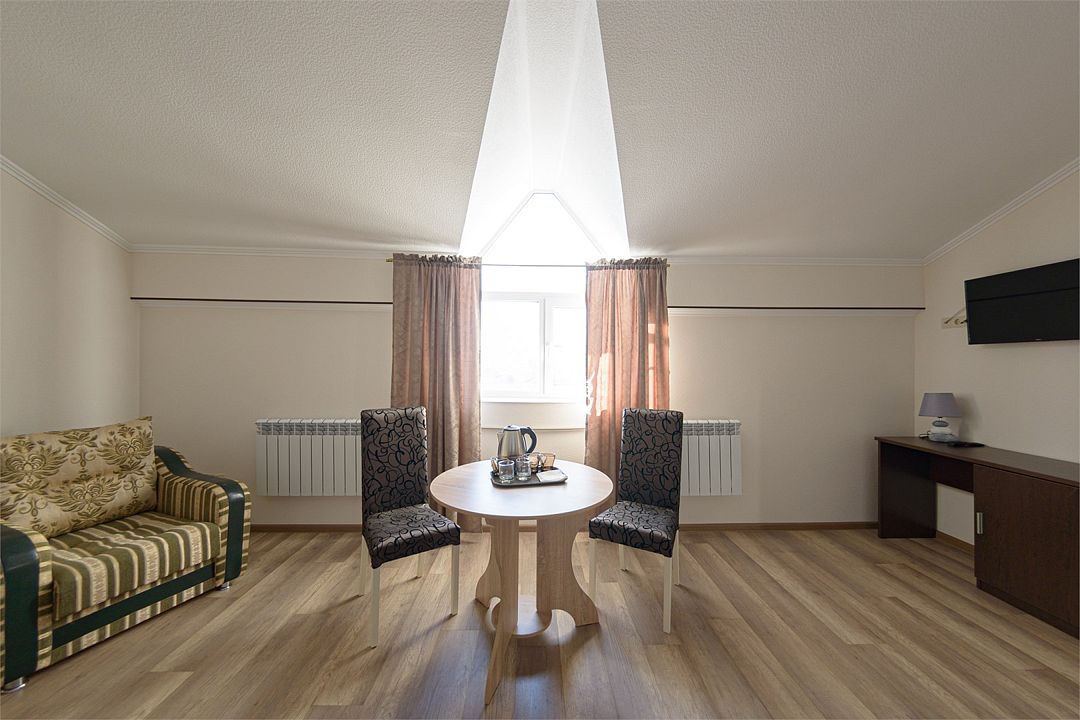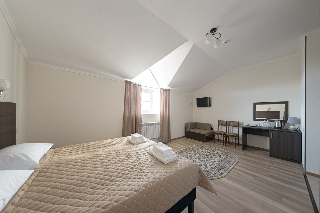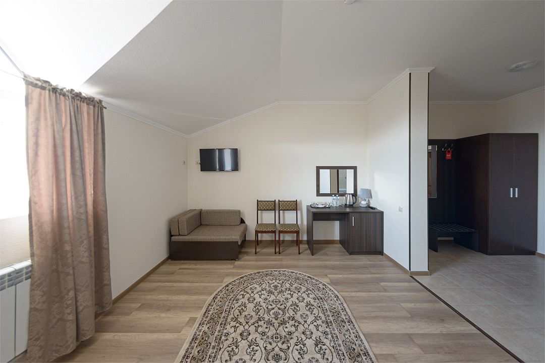 Номер также оснащен необходимой мебелью для приятного отдыха и комфорта, Wi-fi, кондиционер, письменный стол, стулья, полноценная просторная ванная комната, светильник, гостиничная парфюмерия, минеральная вода.