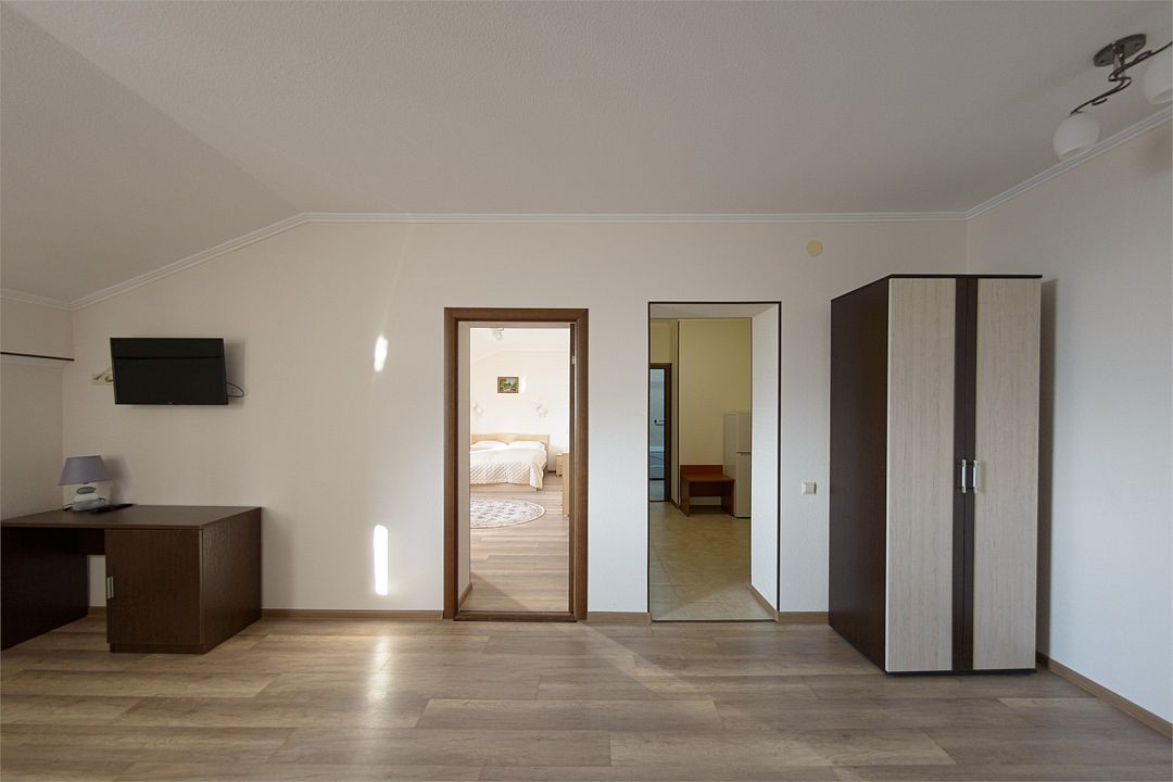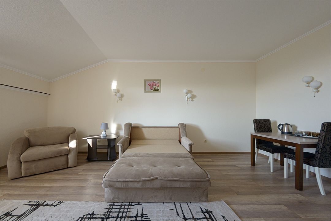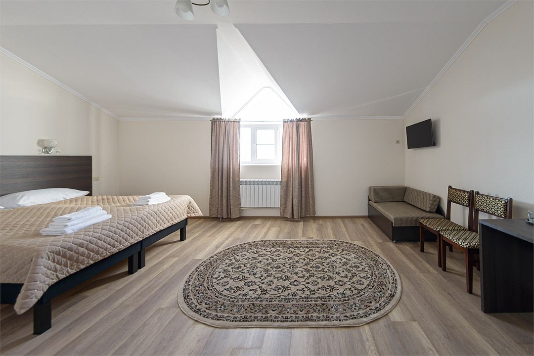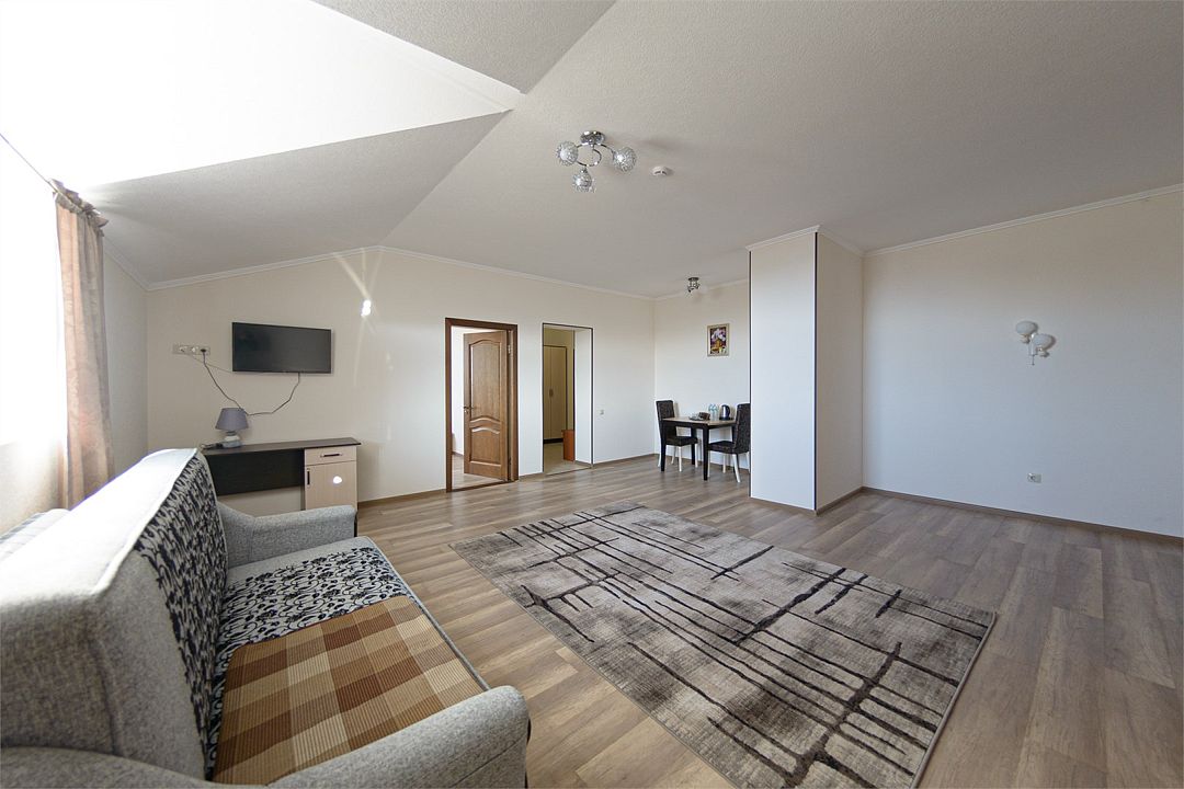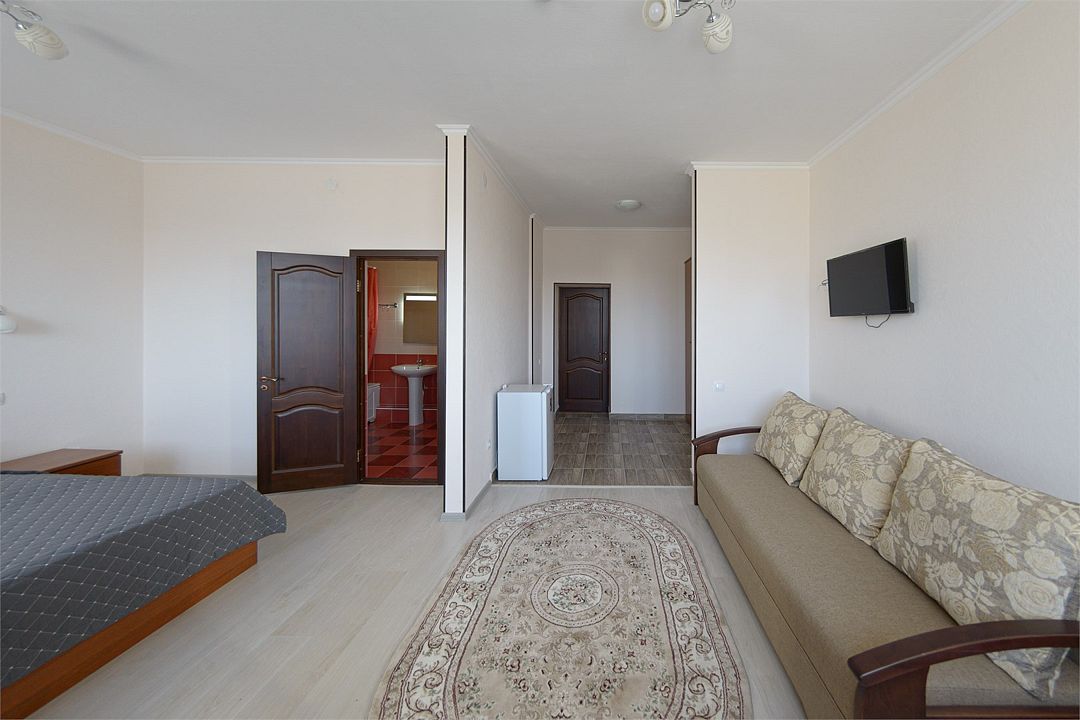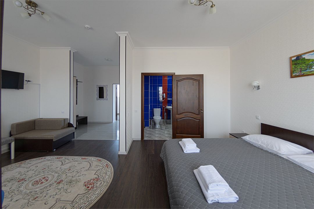 Wi-fi, кондиционер, две большие кровати и диван кровать (одноместное размещение). Для вашего комфорта в данной категории номера предусмотрено два телевизора — сюда так приятно возвращаться после прогулок.