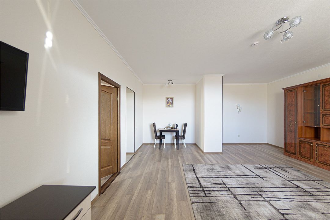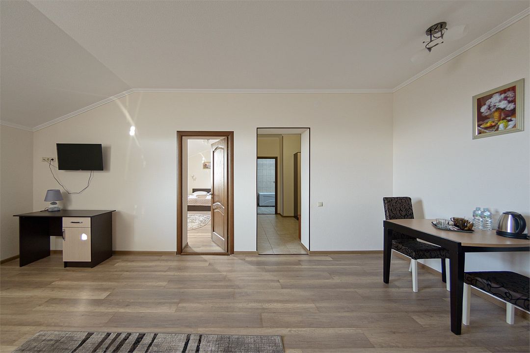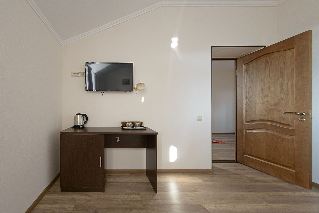 Для вашего комфорта в данной категории номера предусмотрено два телевизора, Wi-fi, кондиционер, светильник, гостиничная парфюмерия, минеральная вода.