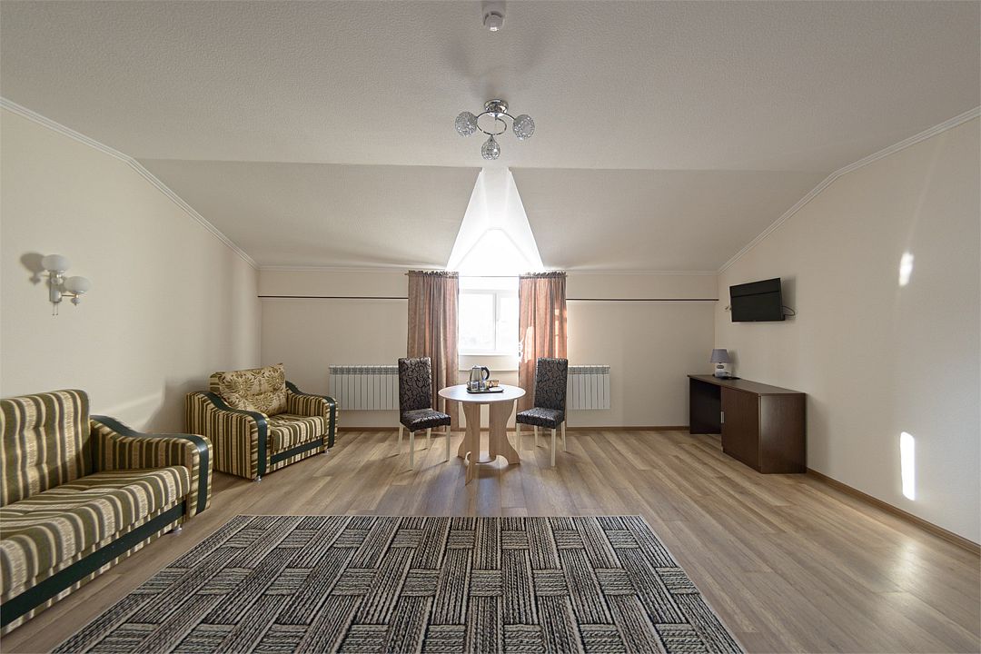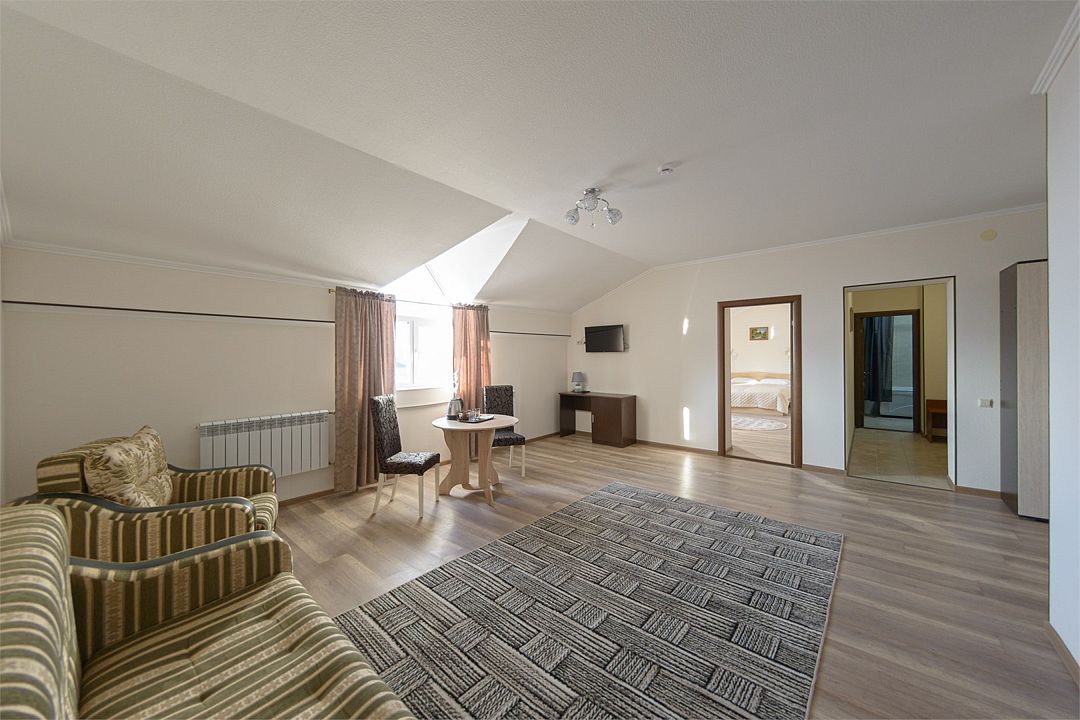 Просторный номер из двух комнат c большой ванной комнатой, располагающий к отдыху интерьер. Максимальное размещение 5 человек. Прекрасно подходит для семей с детьми.