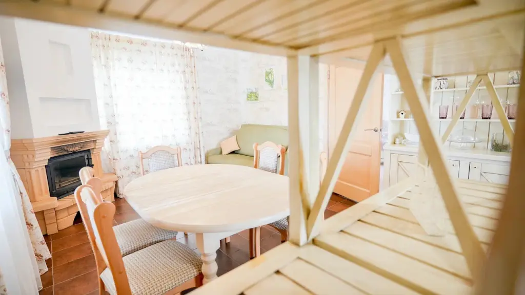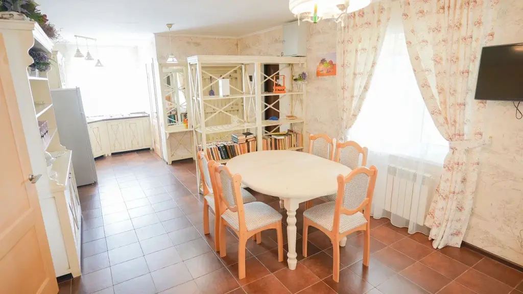 В большой комнате кухонная зона с печкой и кофемашиной, полный набор посуды, гостиная со столом на шесть человек, диваном (раскладным), телевизором, камином и теплым полом.