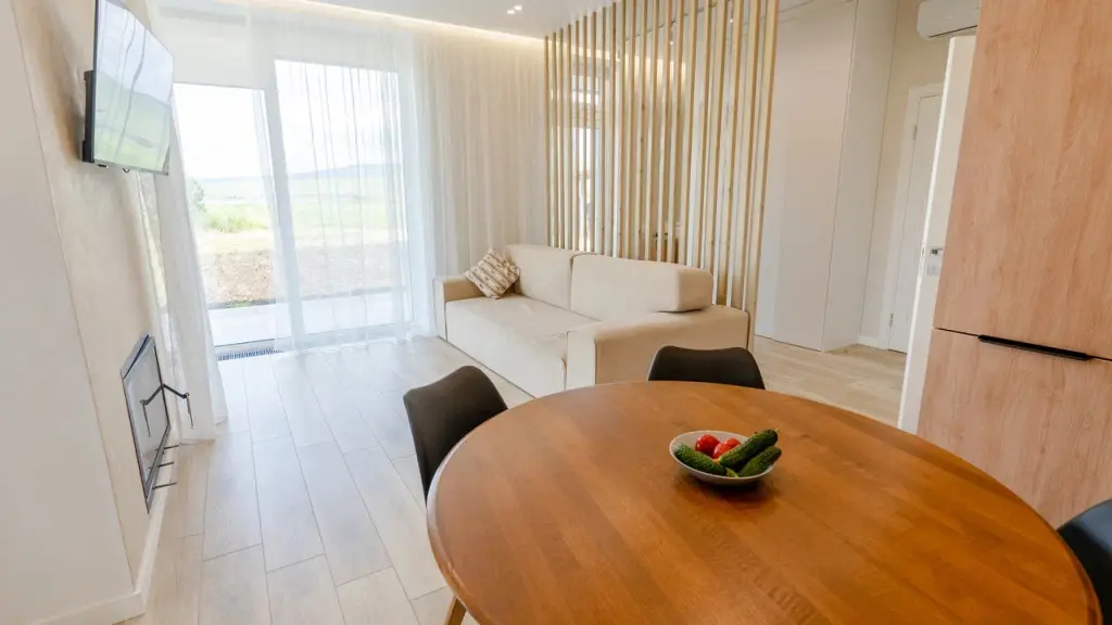 Двухкомнатный домик — двуспальная кровать в отдельной комнате, большой раскладной диван в другой комнате, два санузла. Полноценная кухня, два телевизора, камин, терраса и своя мангальная зона. Панорамные окна в пол с видом на озеро, теплые полы и вся необходимая посуда.