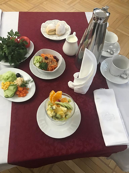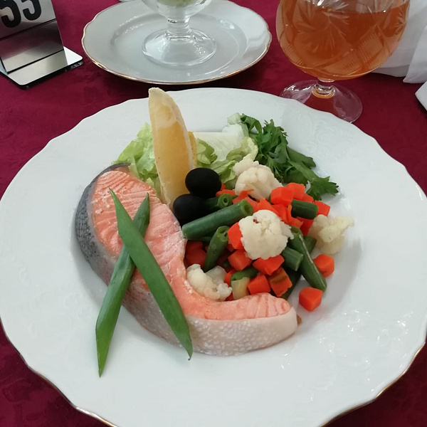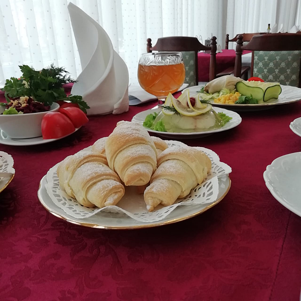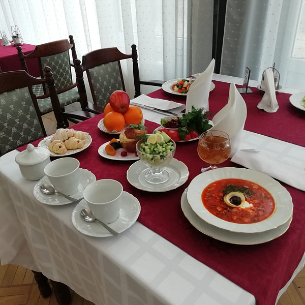 В рационе отдыхающих в течение всего года свежие овощи и фрукты. Питание организовано в одну смену, в уютном обеденном зале, под тихую классическую музыку.