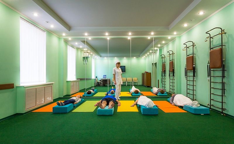 В зале лечебной физической культуры (ЛФК) грамотные инструкторы-методисты с высшим образованием проводят групповые занятия лечебной гимнастикой с элементами йоги и стретчинга, упражнения с различными предметами (гимнастические палки, медболы, мячи, бодибары).