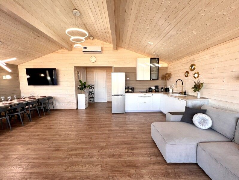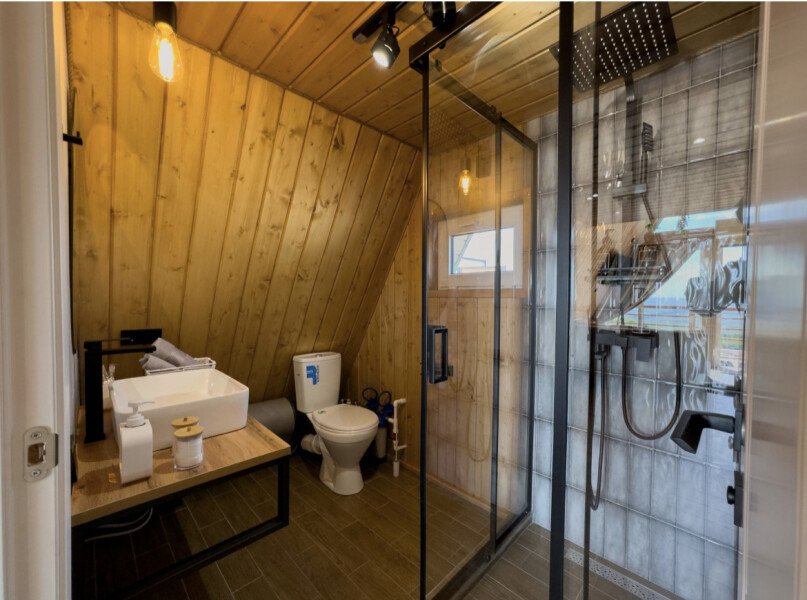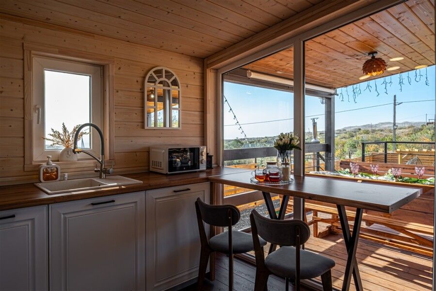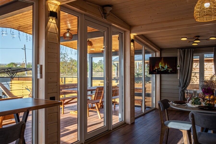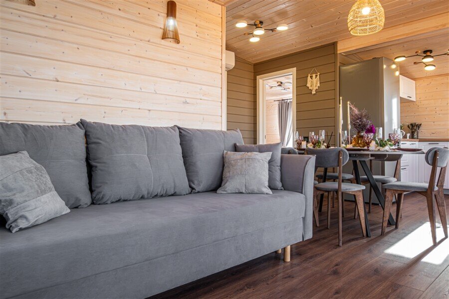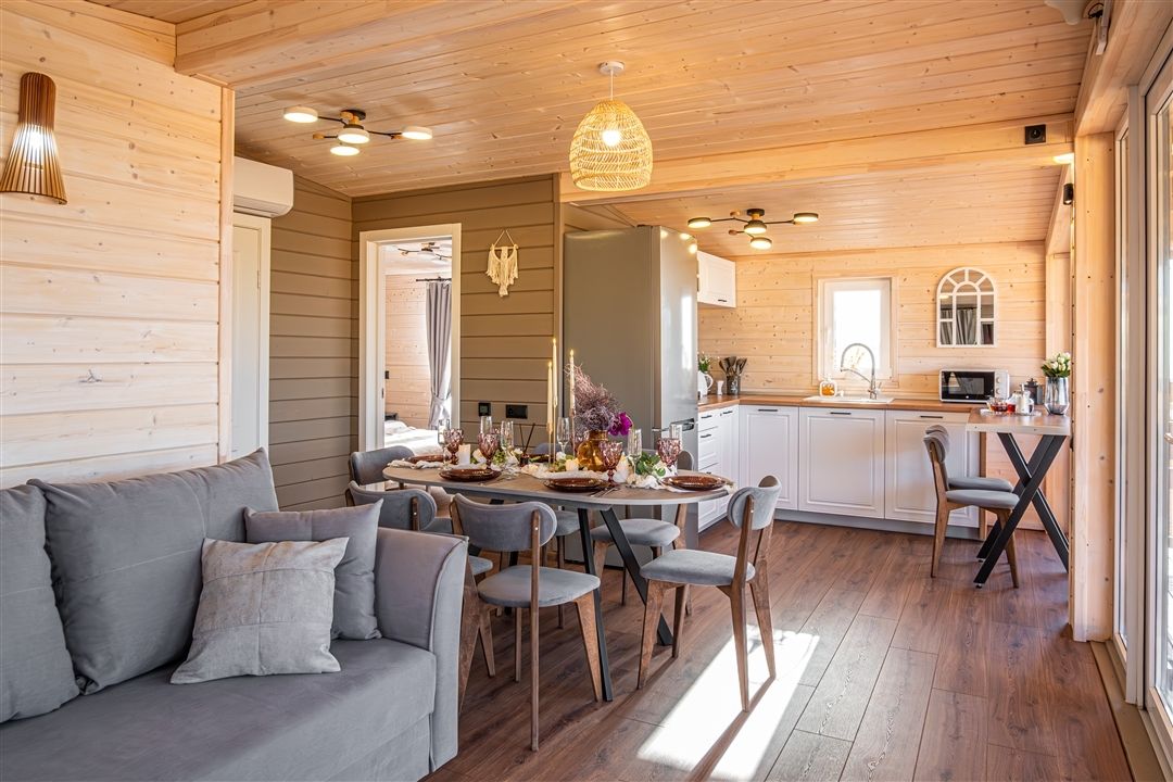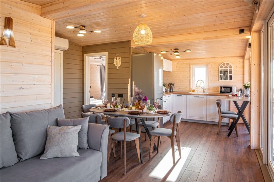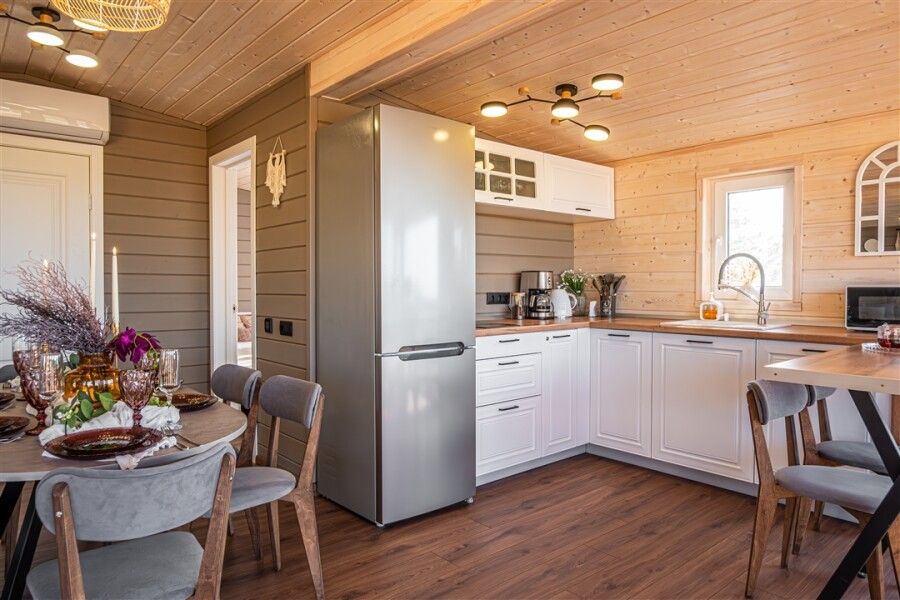 Каждый дом оснащен всем необходимым для комфортного проживания: мини-кухней, уютной гостиной и спальней, а также санузлом с душем. Гости могут воспользоваться современными удобствами, такими как сплит-система, холодильник, посудомоечная машина и мощная Wi-Fi сеть.