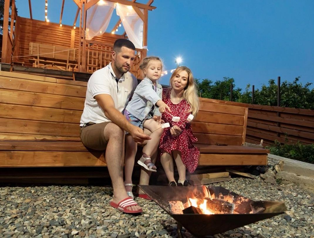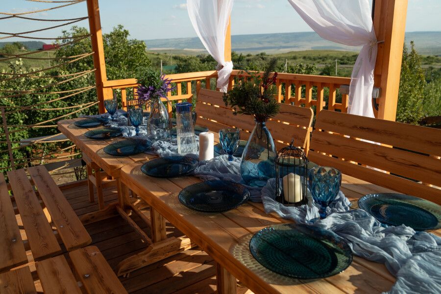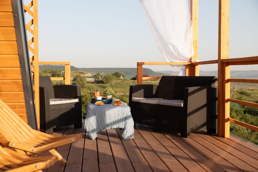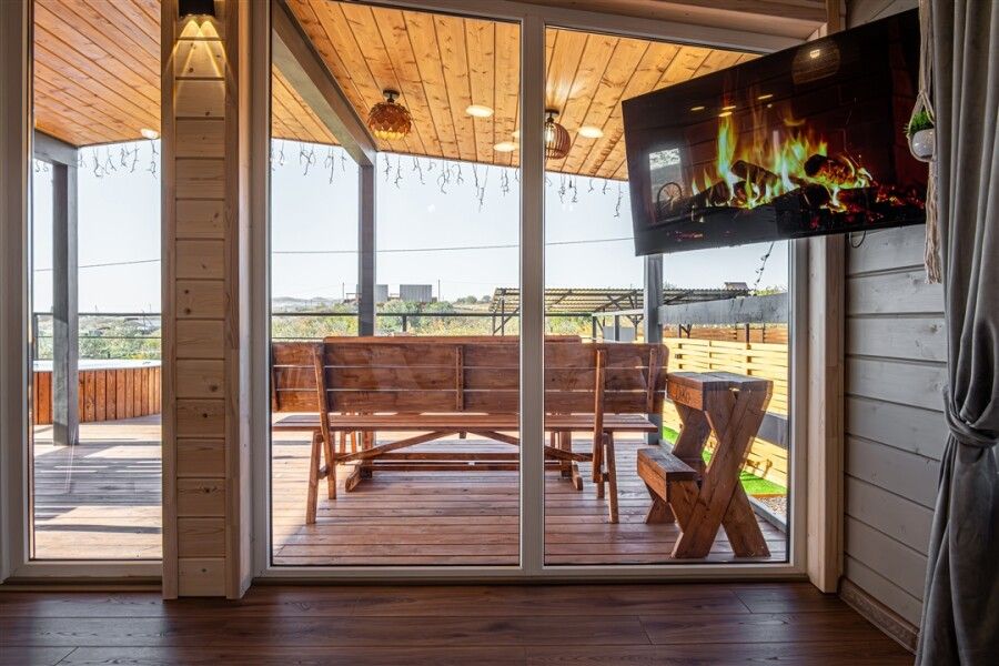 На вашей огороженной территории: терраса 22 м² с видовым гамаком и садовой мебелью, беседка (макс. 15 человек), мангальная зона, чан (доп. плата) и зона кострища. Wi-Fi и усилитель сотовой сети на всей территории.
