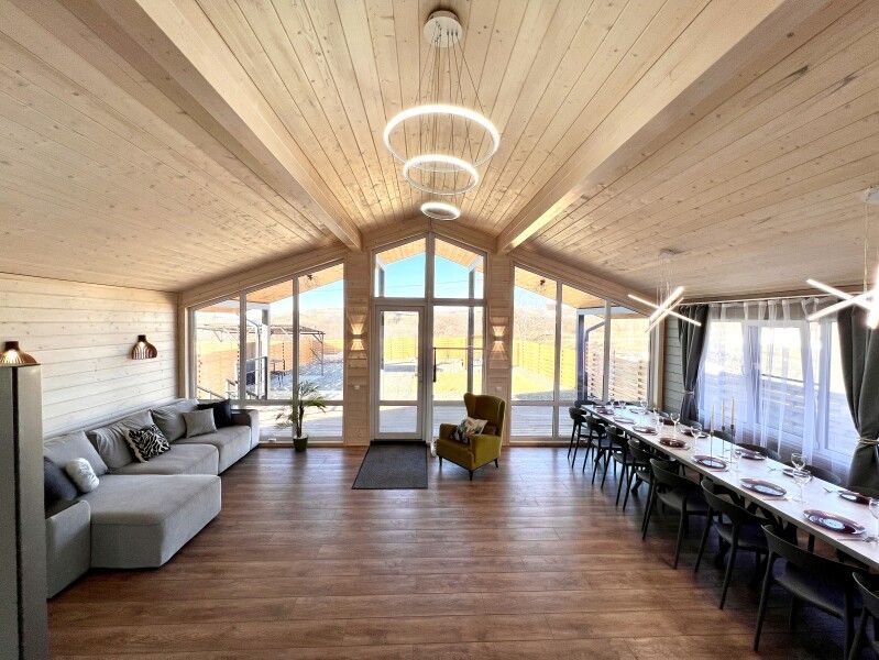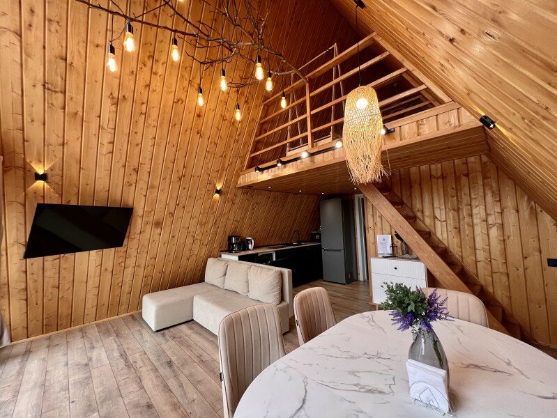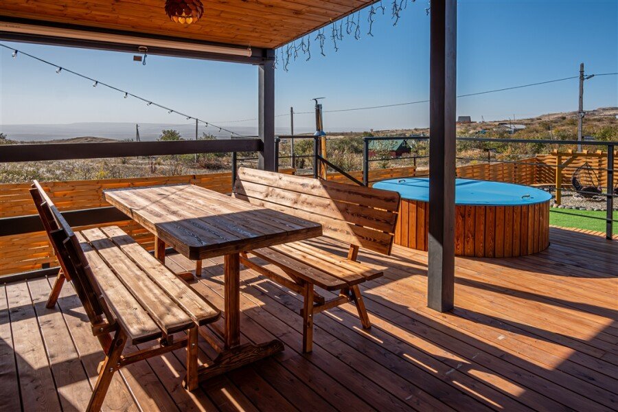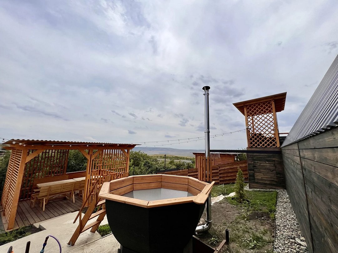 На территории каждого домика есть красивая беседка и терраса, где можно насладиться панорамными видами и отдохнуть у мангала или в банном чане. Для любителей музыки и развлечений предусмотрена профессиональная караоке-система. Барнхаус также предлагает дополнительные удобства: подогреваемую купель с джакузи, где вы сможете расслабиться в чистой воде с мягким освещением.