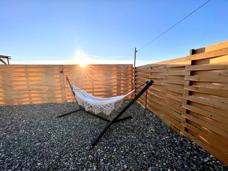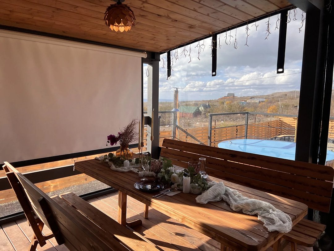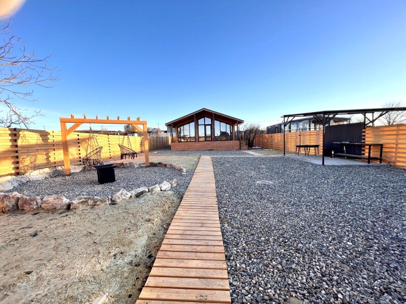 Домик «Закат» на участке 5,5 соток и с видом на Сенгилеевское озеро и равнины Кавказа. В домике 6 спальных мест, 2 отдельных спальни с двуспальными кроватями и кухня-гостиная с раскладывающимся диваном.