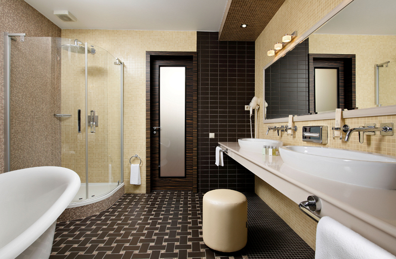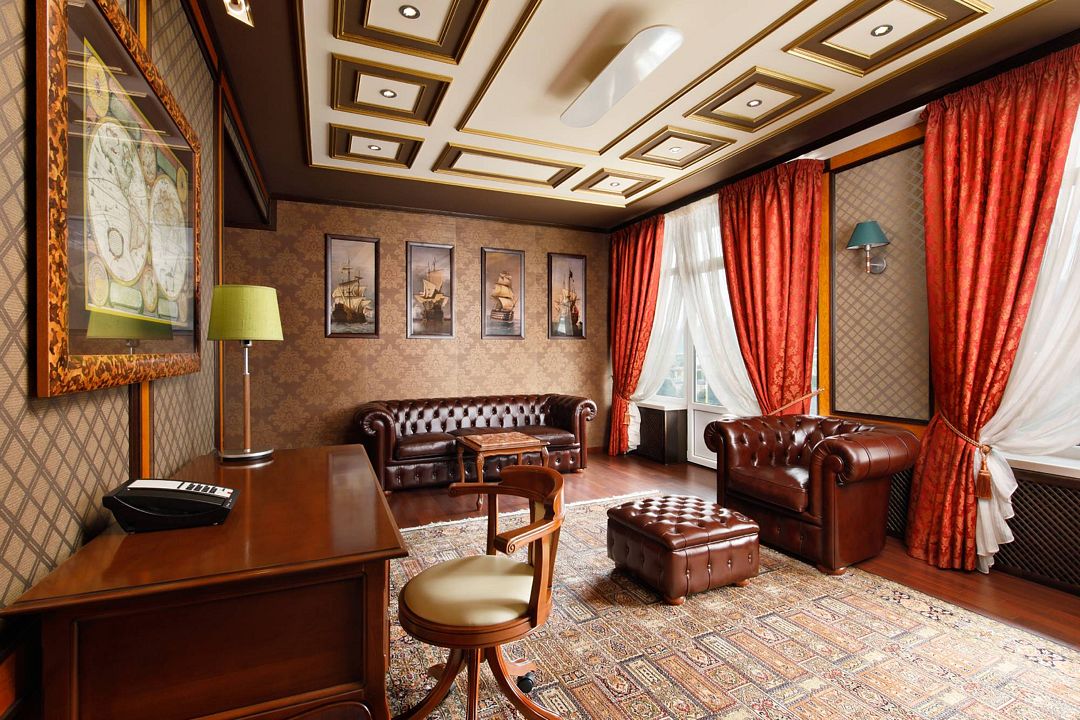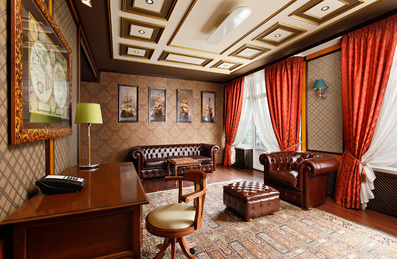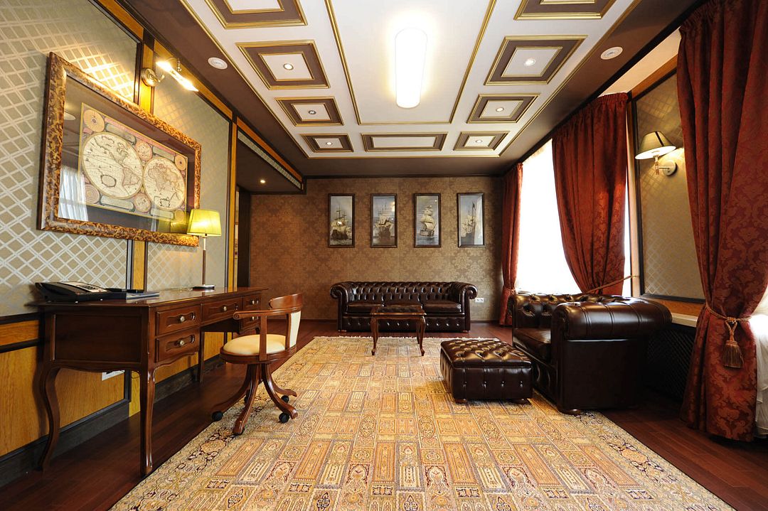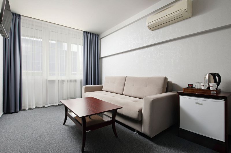Номер повышенной комфортности площадью 60 кв.м., расположен на 8 этаже отеля. В распоряжении гостей номера гостиная и спальня, зона бара, гардеробная, большой балкон, ванная комната и санузел.