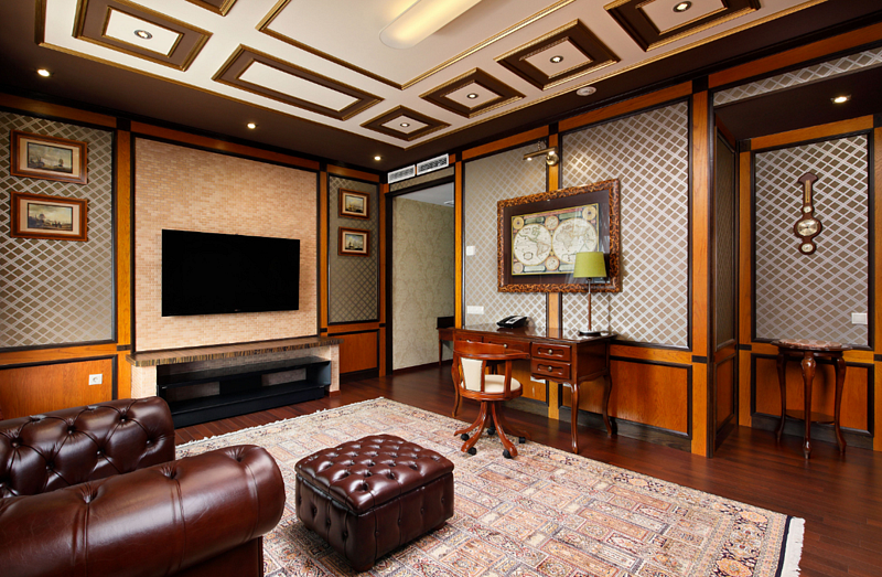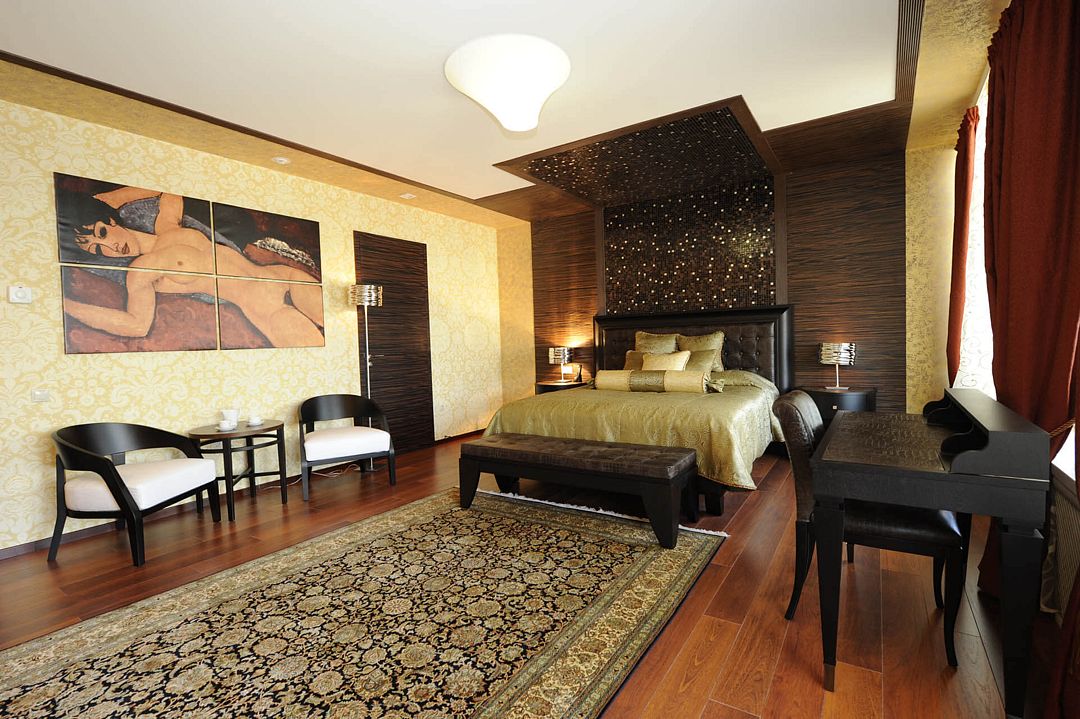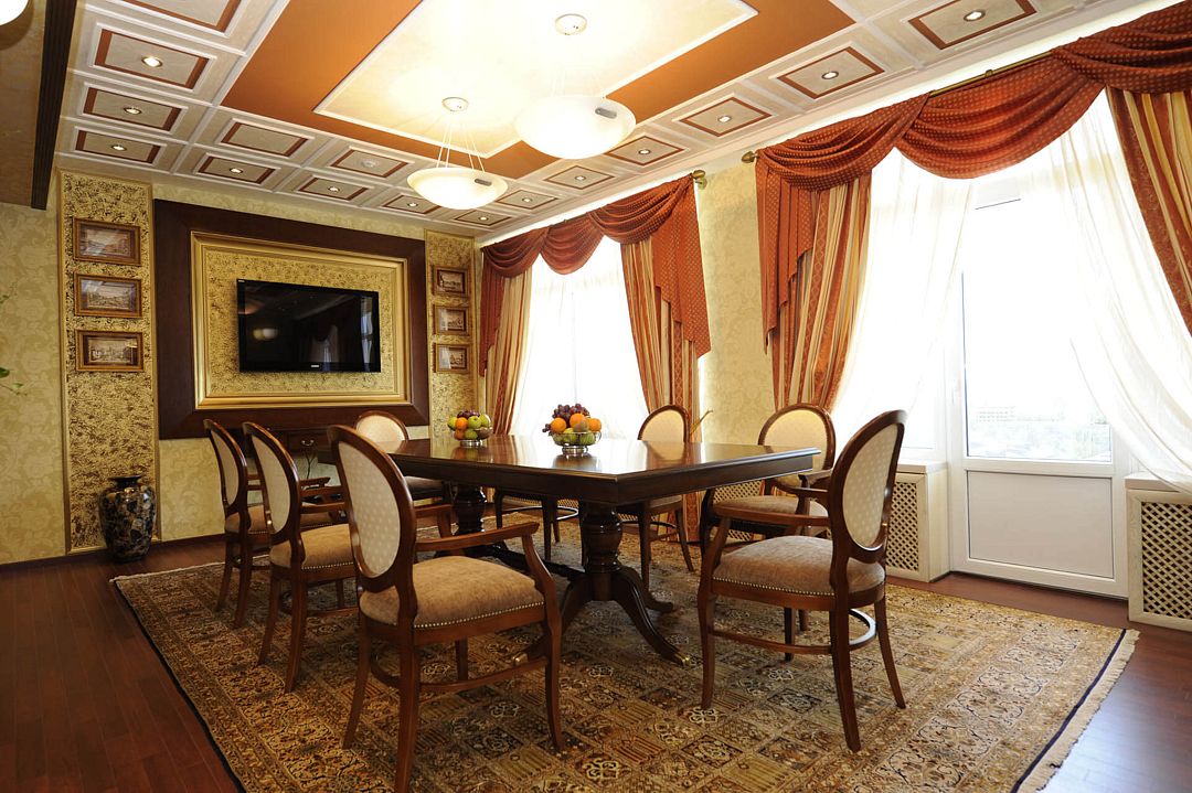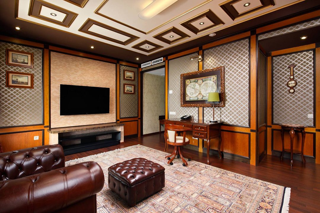 Роскошный номер площадью 145 кв.м., с большим балконом расположен на 8 этаже отеля. Из номера открывается вид на гору Эльбрус и Кавказский хребет. В номере - холл, рабочий кабинет, обеденный зал, чайная комната, зона бара, спальня, ванная комната, две гардеробные и два санузла.