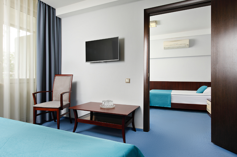 Уютный двухкомнатный номер с балконом, двуспальной кроватью и двумя раздельными односпальными кроватями. Отлично подойдет для Гостей с детьми. Площадь номeра 28 кв.м.