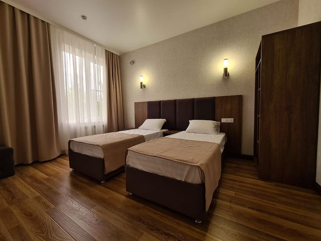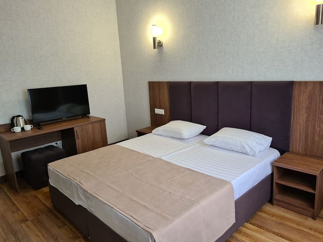 Уютные комфортные номера с большой кроватью либо с двумя отдельными кроватями и ортопедическим матрацом.Номера оснащены сплит системой,телевизором.В номере имеется чайник,минеральная вода.Ванная комната оснащена феном и всеми необходимыми средствами гигиены.Услуги и удобства