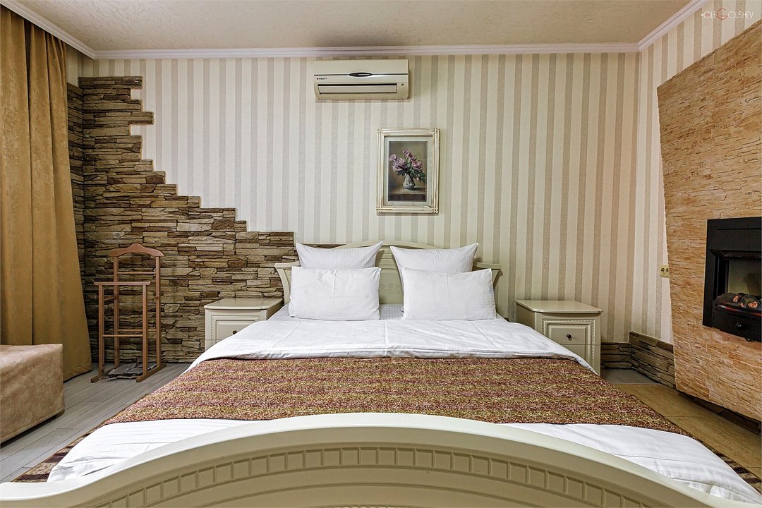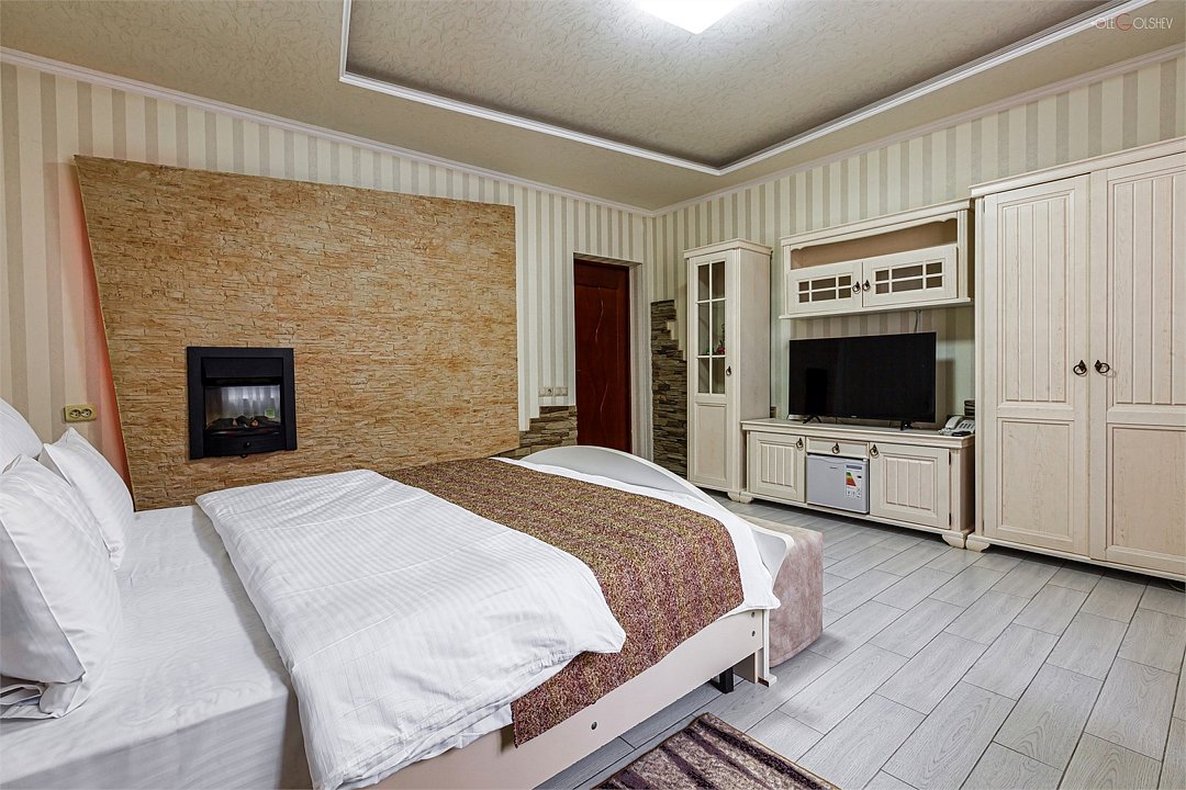 Просторный элегантно оформленный номер ЛЮКС, с площадью 90 км м., с панорамными окнами во двор. Номер разделен на спальную зону, гостиную (зону отдыха) и кухонную. В номере: кровать«King-size» , украшенная балдахином, туалетный столик, большой раскладной диван, журнальный столик, камин. Мини кухня оборудована микроволновой печью, раковиной, чайником и столовыми приборами. Ванная комната оснащена ванной с джакузи и душевой кабиной.Услуги и удобства