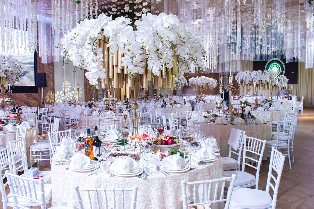 Несмотря на свою ненавязчивость и нейтральность, белый цвет в интерьере зала выглядит действительно торжественно, а обилие света и необычное зеркальное оформление добавляют элегантности и создают атмосферу праздника.Белый зал – идеальное решение не только для свадебного банкета, но и для корпоративов, юбилеев, и других особенно радостных торжеств семьи.