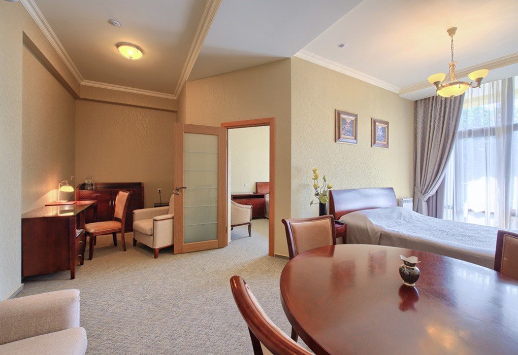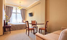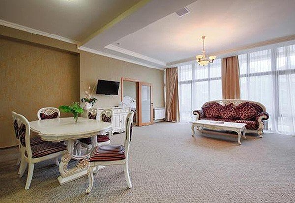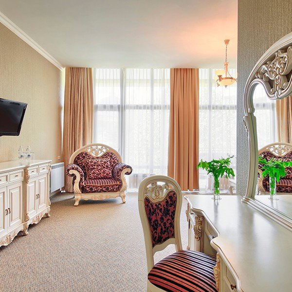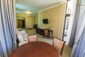 Номер состоит из спальни и гостиной, с большой семейной кроватью. Уютный интерьер, мебель в классическом стиле.