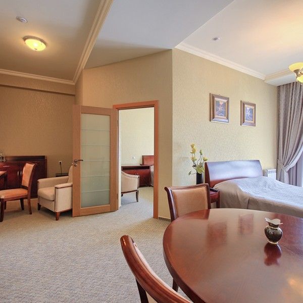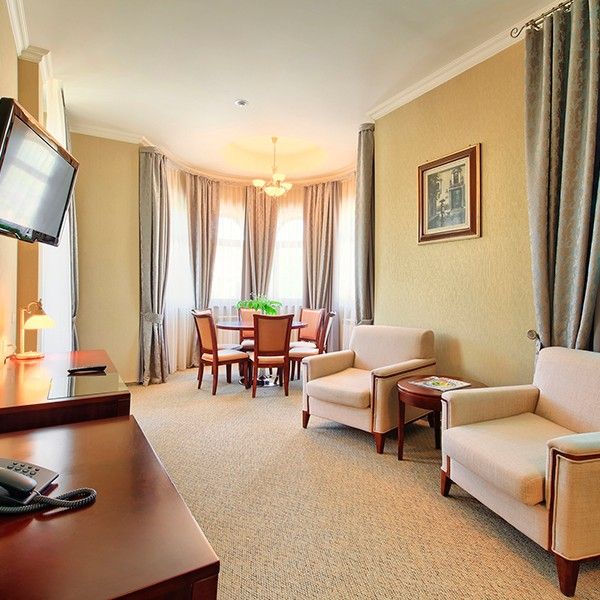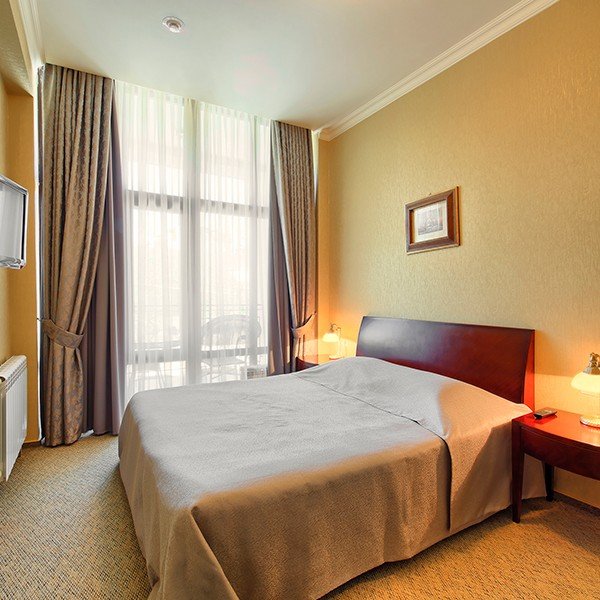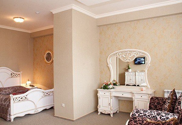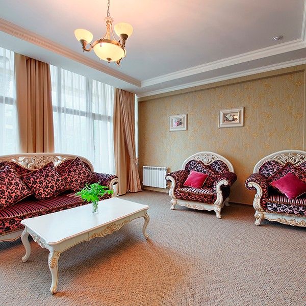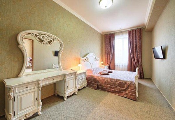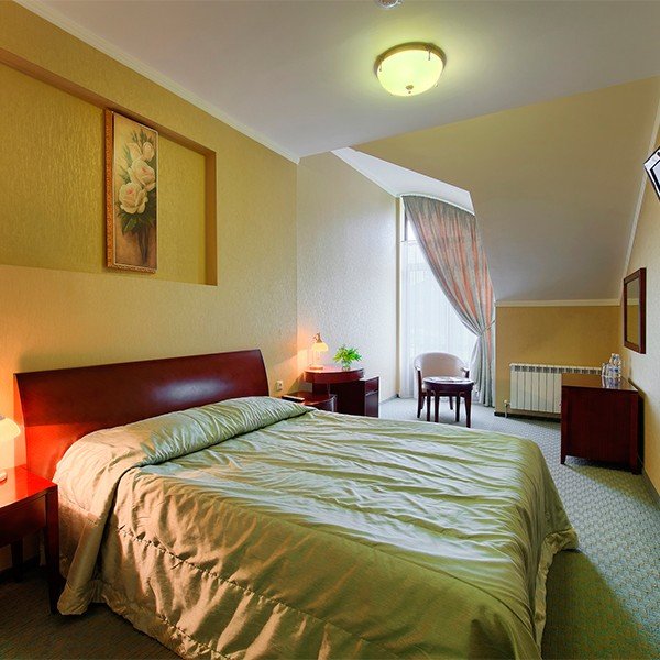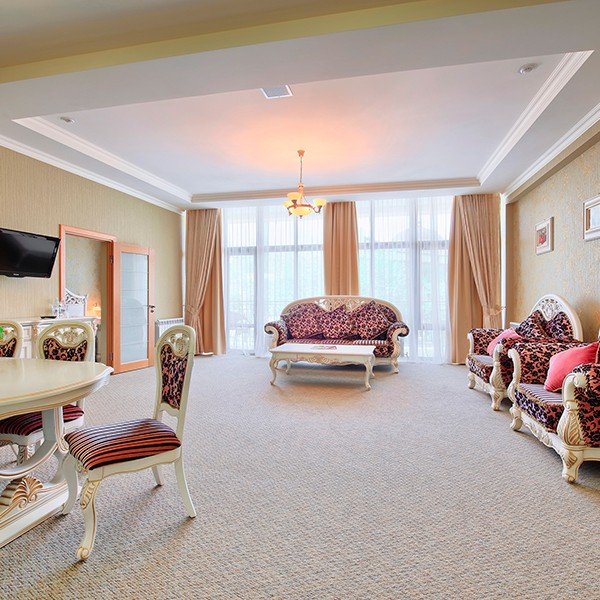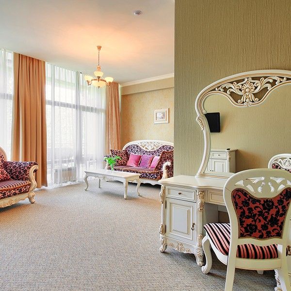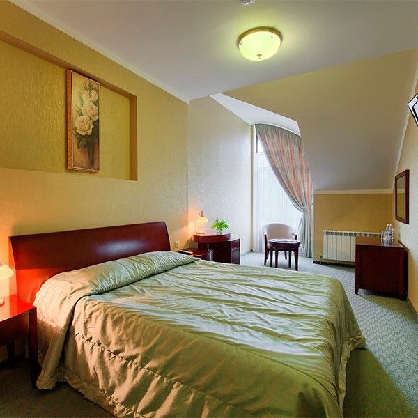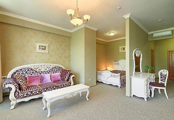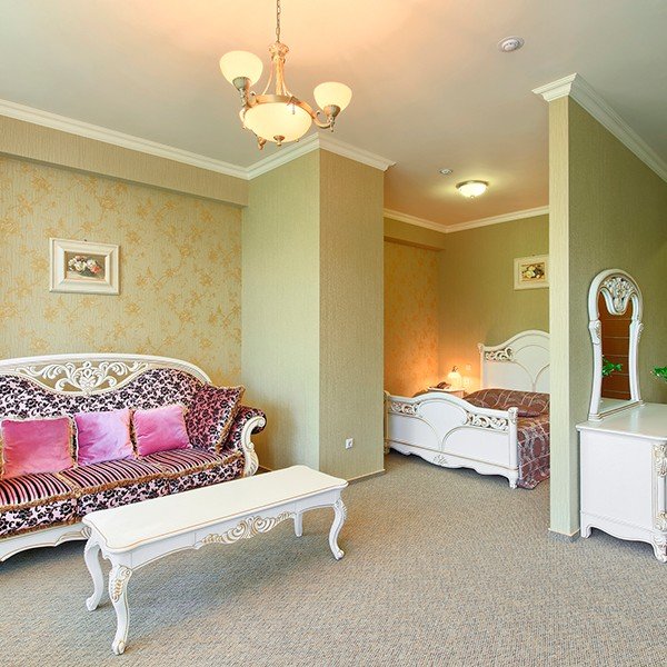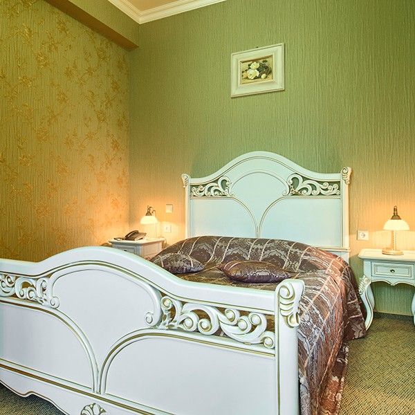Однокомнатный номер, разделенный на зону спальни и гостиной, в стиле барокко. Изюминкой номера является неповторимый стиль и интерьер.