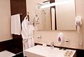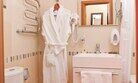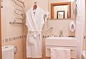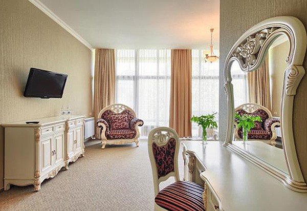 интерьер номера выполнен в классическом итальянском стиле с присущей ему вычурностью и дороговизной обстановки. В гостиной комнате расположен итальянский мебельный гарнитур – удобный диван и два кресла, журнальный столик для чаепитий. Также здесь есть туалетный столик с уже приготовленным набором различных косметических средствУслуги и удобства