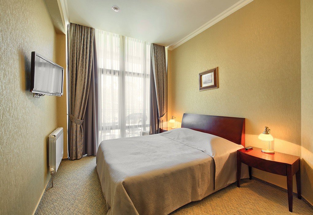 Комфортабельные 27 номеров различных категорий в элегантном европейском стиле, окна которых выходят на лечебный парк или на Театральную площадь с живописными фонтанами и видом на Эльбрус. Номера оборудованы кондиционерами, удобной мебелью, оснащены телевизором, холодильником, мини-баром, сейфом, телефоном, в большинстве номеров балконы с плетеной мебелью. В ванных комнатах, имеющихся во всех номерах, предусмотрена индивидуальная косметика, ежедневно пополняемая: шампунь, гель для душа, зубной набор, мыло, шапочка для душа, а также фен, халаты и тапочки.