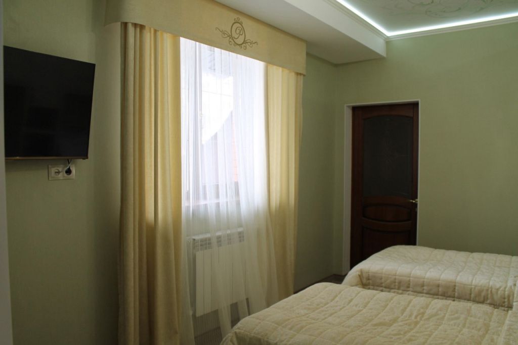 Семейный номер с одной односпальной и одной двуспальной кроватью, с балконом. Совмещенный санузел с душевой кабиной.