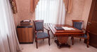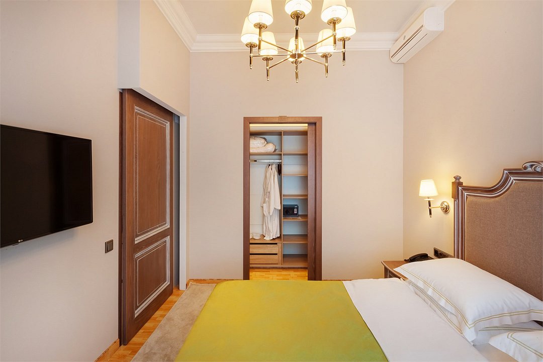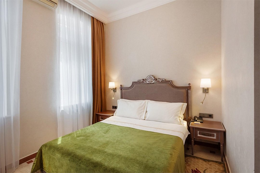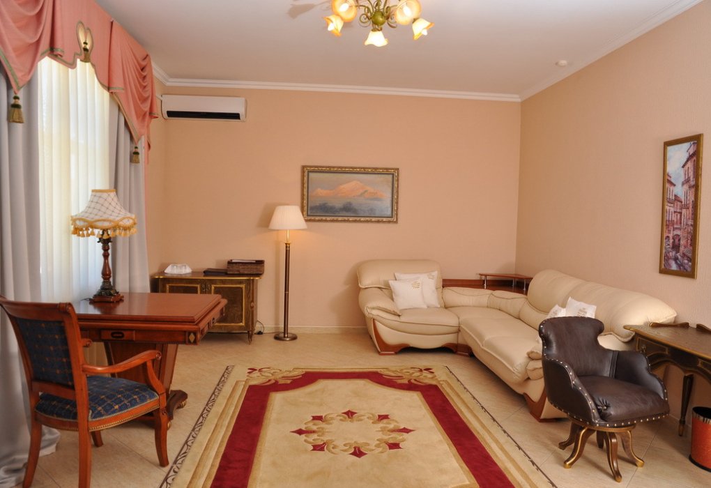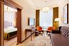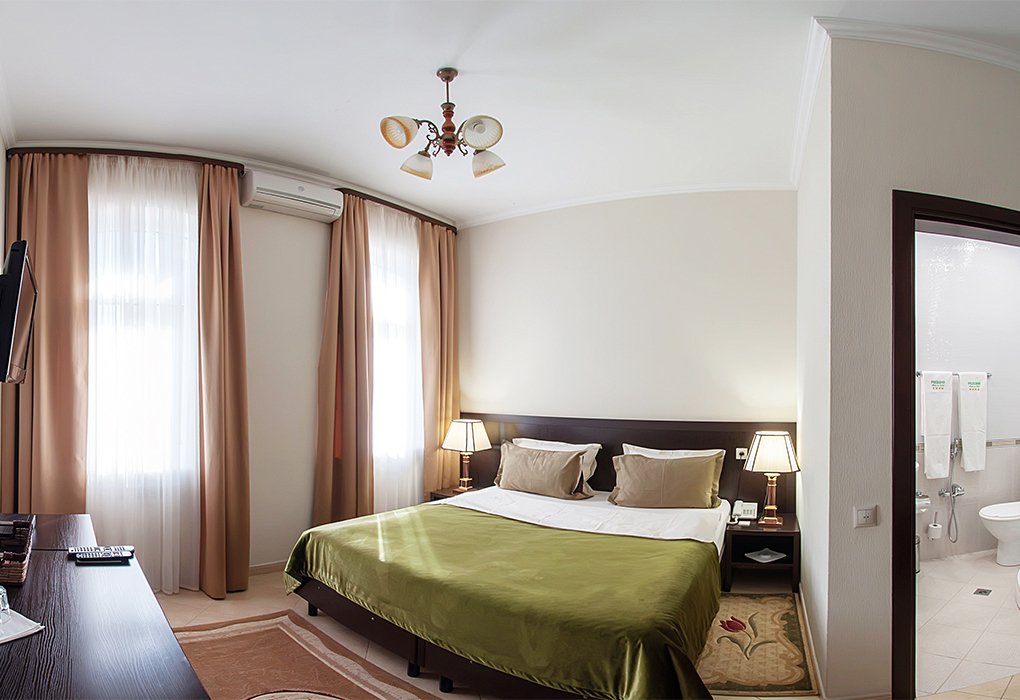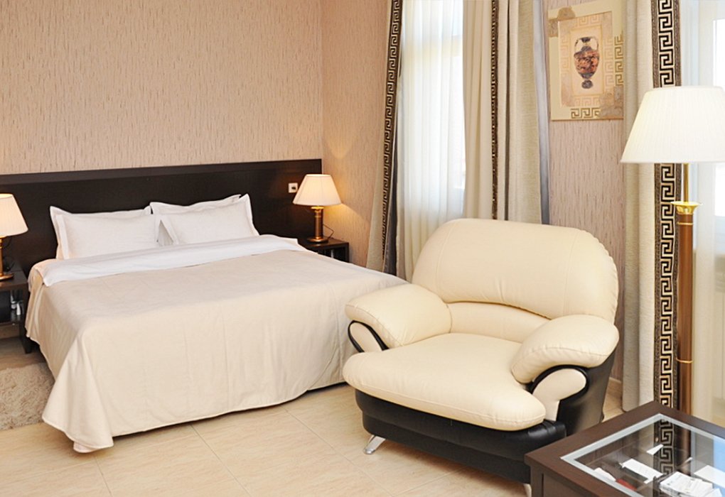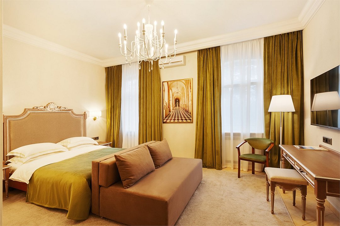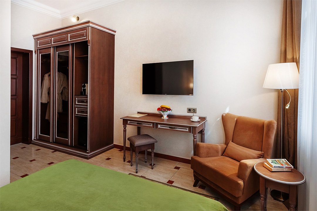 Интерьер выполнен в классическом стиле, имеется мягкая мебель, журнальный столик, большая двуспальная кровать, антиаллергенные подушки и бельё, затемняющие шторы, LD телевизор, DVD, сейф, мини-бар. Ванная комната оборудована душевой кабиной, полотенцесушителем, биде, также для Вас — фен, увеличивающее зеркало, набор косметики, махровый халат и тапочки с монограммой отеля.