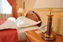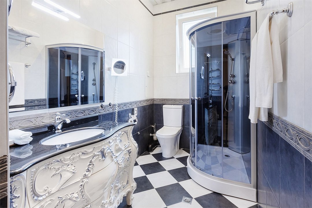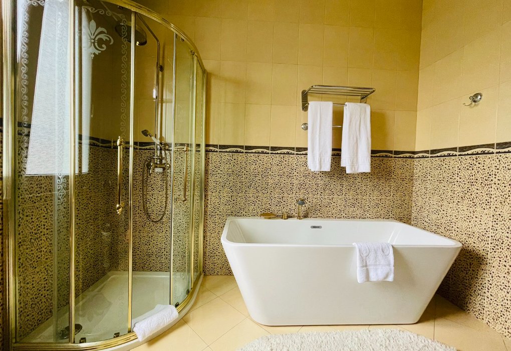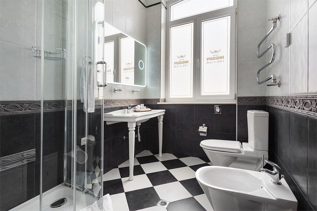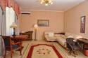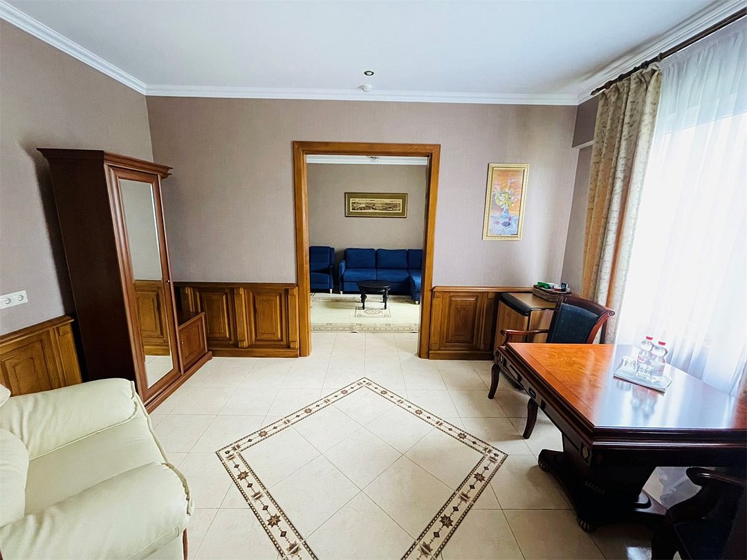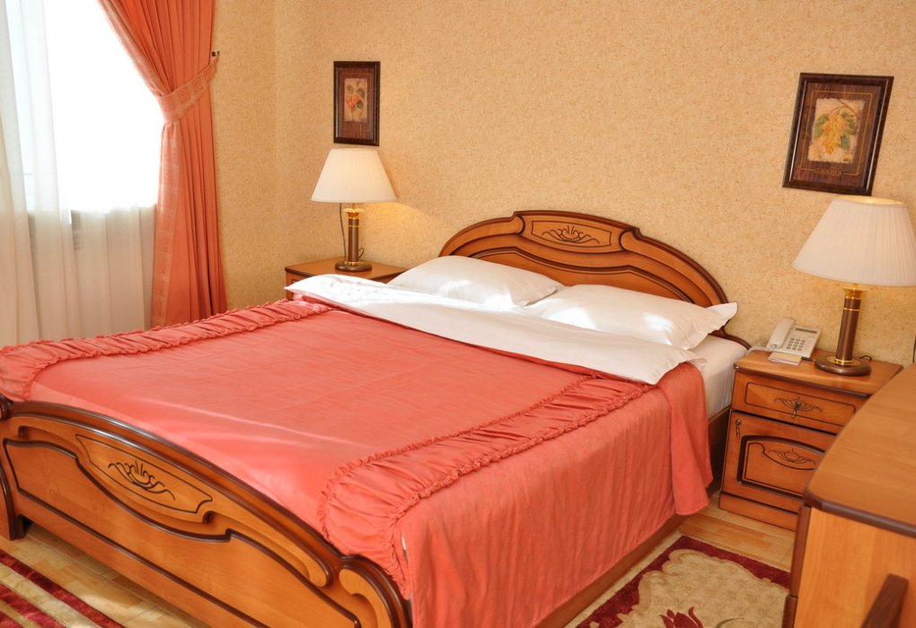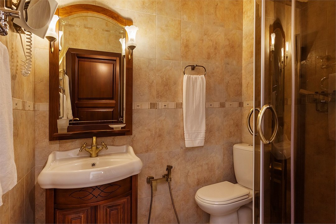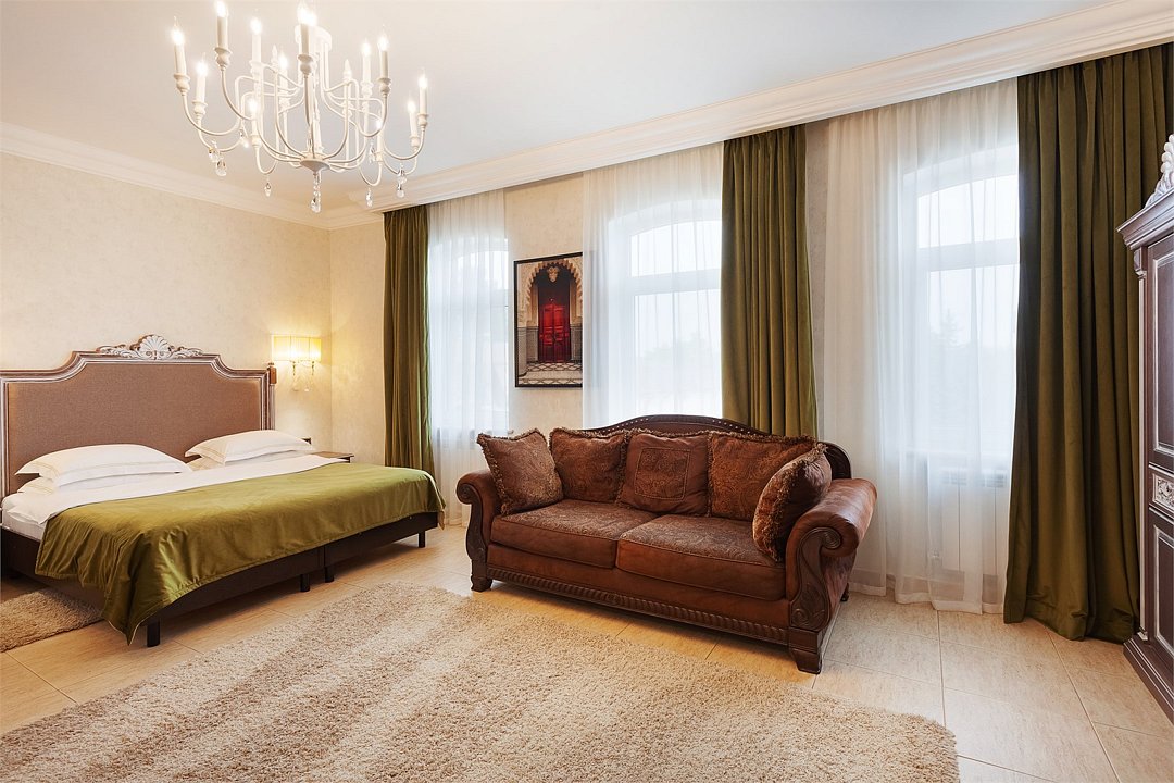 Интерьер выполнен в классическом стиле, имеется мягкая мебель, журнальный столик, большая двуспальная кровать, антиаллергенные подушки и бельё, затемняющие шторы, LD телевизор, DVD, сейф, мини-бар. Ванная комната оборудована душевой кабиной, полотенцесушителем, биде, также для Вас — фен, увеличивающее зеркало, набор косметики, махровый халат и тапочки с монограммой отеля.