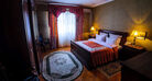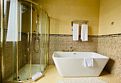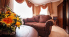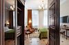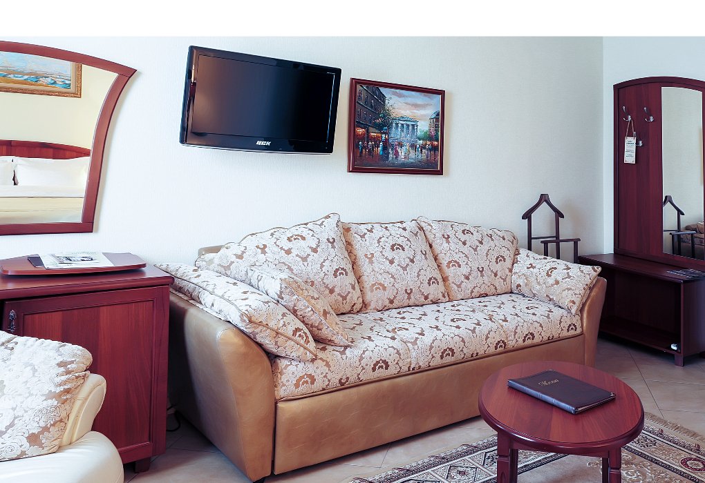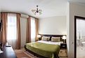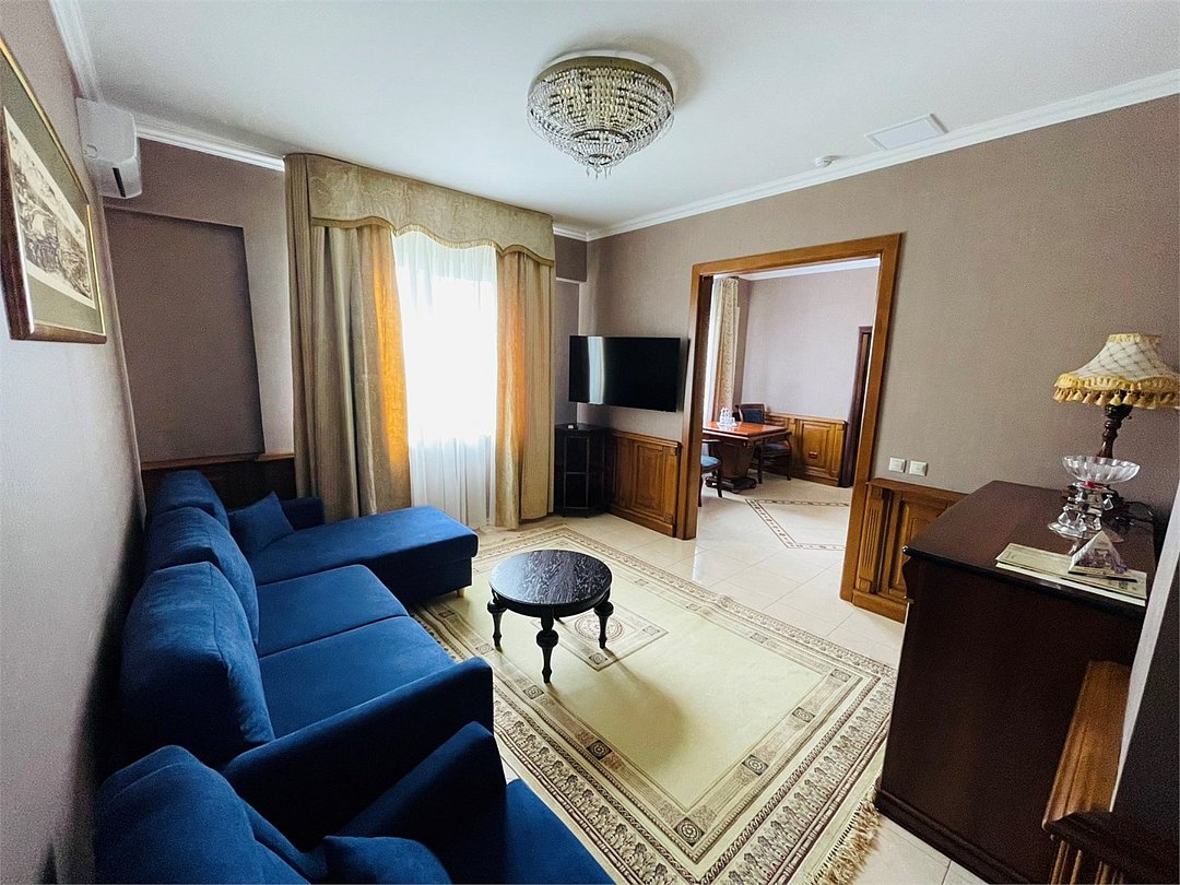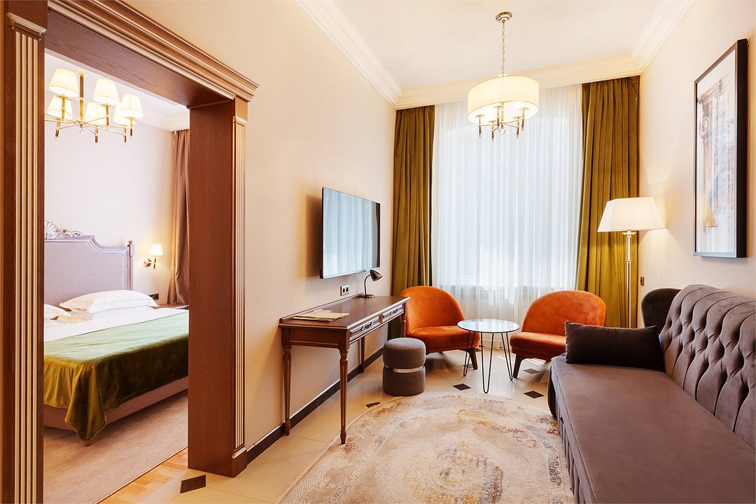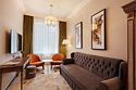 Комфортная спальня с двуспальной кроватью, затемняющими шторами, антиаллергенными подушками и бельём, элегантная гостиная с удобной мягкой мебелью, а также отдельной зоной отдыха с балконом. Номер оснащен телевизором, сейфом, мини-баром. Ванная комната оборудована джакузи с душевой кабиной, полотенцесушителем, биде также для Вас — фен, увеличивающее зеркало, набор косметики, махровый халат и тапочки с монограммой отеля.