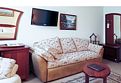 Гостиная комната с плоским телевизором, диваном и журнальным столом одновременно может служить рабочим кабинетом. В спальне большая двуспальная кровать, антиаллергенные подушки и бельё, затемняющие шторы, LD телевизор, DVD, сейф, мини-бар. Ванная комната оборудована душевой кабиной, полотенцесушителем, биде, также для Вас — фен, увеличивающее зеркало, набор косметики, махровый халат и тапочки с монограммой отеля.
