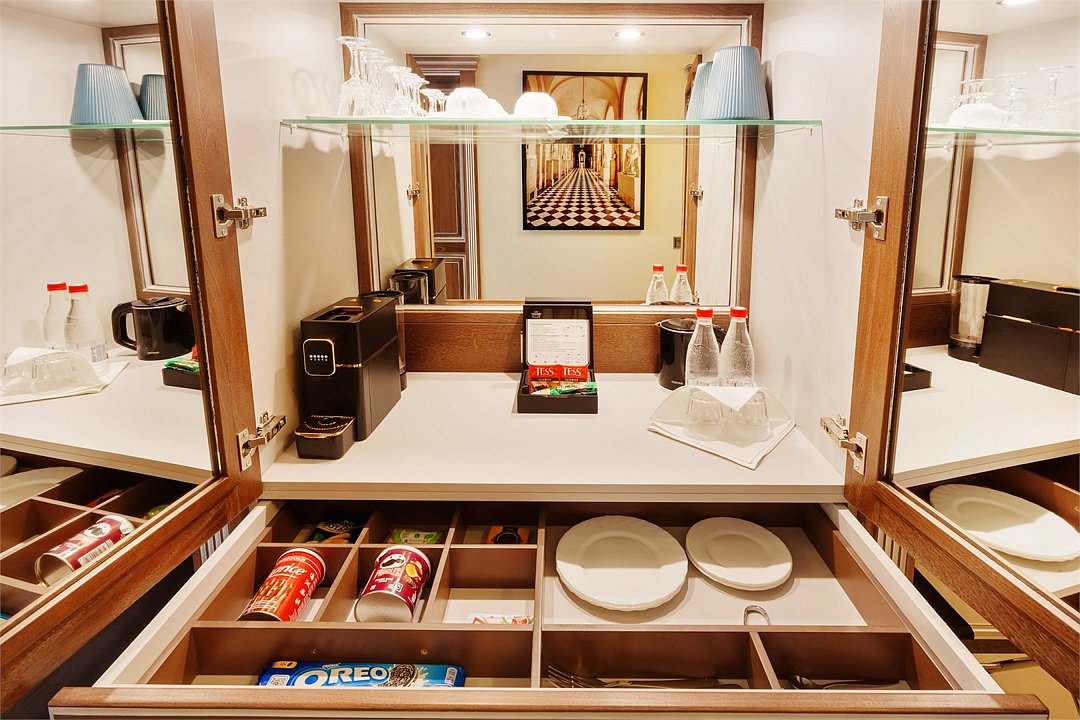 Путешествие с семьейПрекрасная локация и хороший сервисЗабронировали на 3 дня двухкомнатный бизнес- люкс, так как путешествовали с двумя маленькими детьми! Очень уютный и стильный отель. Номера супер эргонамичные. Дизайн современный с элементами классики. СПА услуги на высоком уровне при адекватной цене. Есть одно замечание- ребенок до 5- ти лет за человека не считается, поэтому завтраков у нас было 3!!! И дело не в количестве еды, её с лихвой хватило! Дело в напитках. В отеле такого уровня- можно было выбрать либо сок, либо кофе, либо чай! Так как нас было 4- ро, а соков 3 - мы их делили((( Смешно конечно. Но когда мы спросили можно ли вместо 3-х каш заказать 2 кофе - нам ответили, что это невозможно!!! Я очень много путешествую, это был первый раз, когда я не могла на завтрак выпить вкусного ароматного кофе((( Для 4-х звезд практика во асем мире на завтрак напитки без ограничаения! Можно просто роставить графин с соком, графин с водой, молоком и т.д… А рядом титан с горячей водой и пакетиками чая и кофемашину. Тем более, что везде коЕмашины для таких заведений предоставляютя бесплатно! Только кофе у них покупай! Надеюсь в следующий приезд увидеть такие изменения к лусшему! Кспехов и процветания вашему бизнесу! Спасибо 🙏