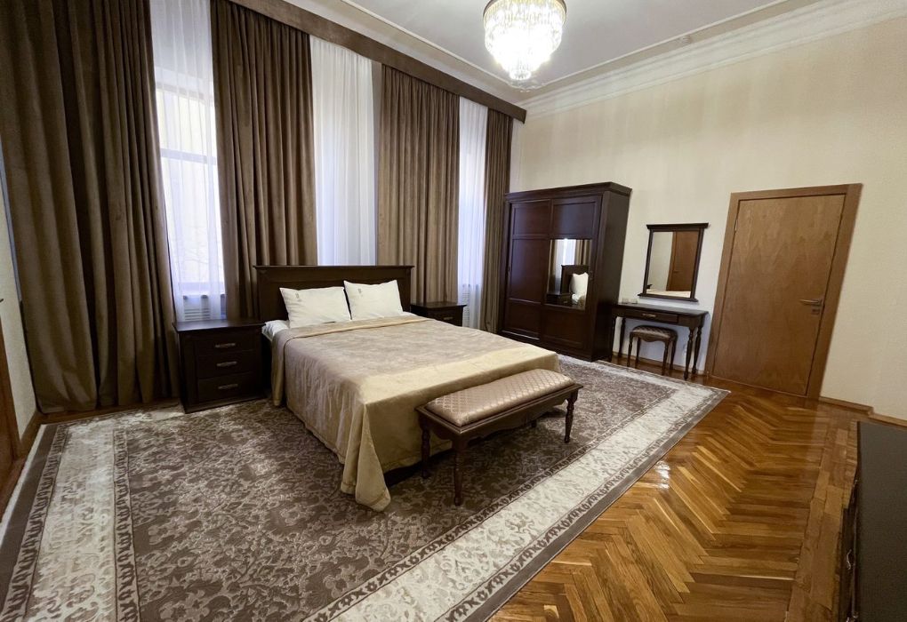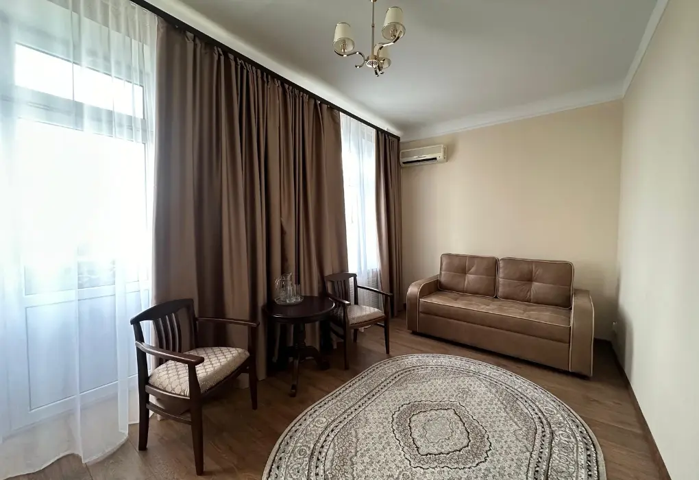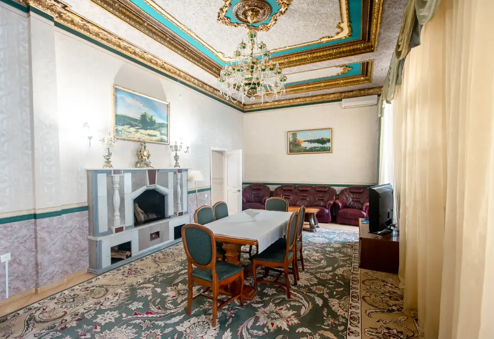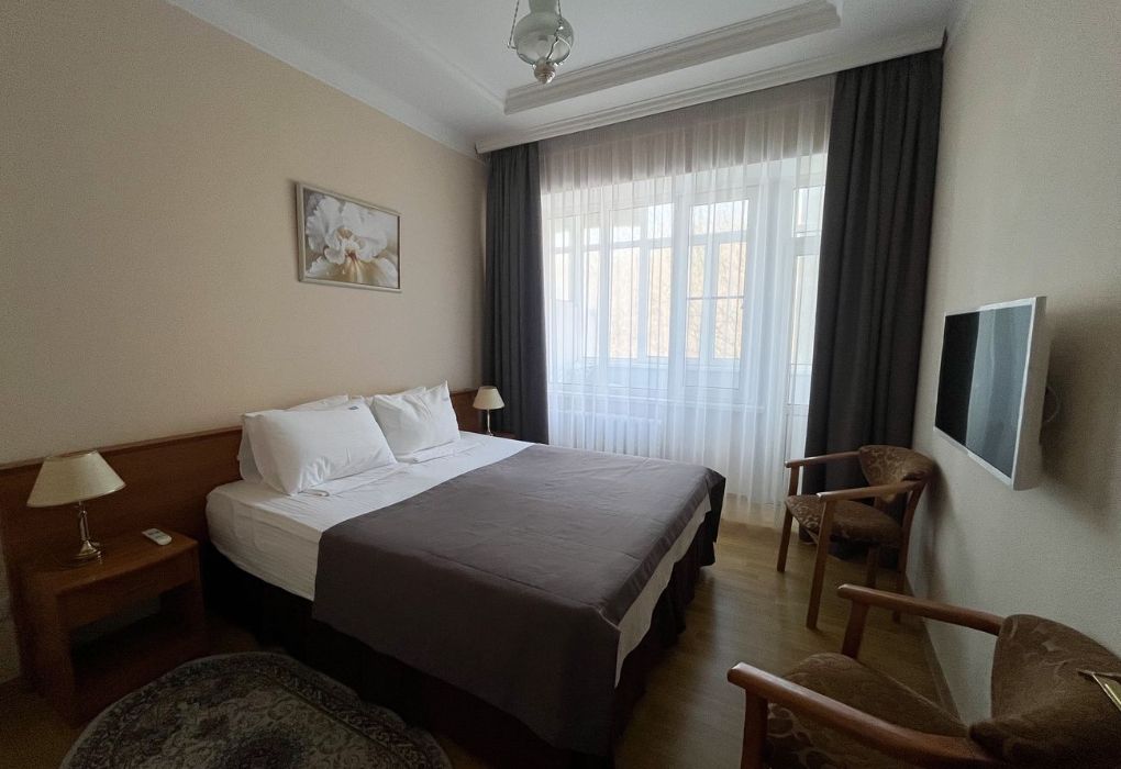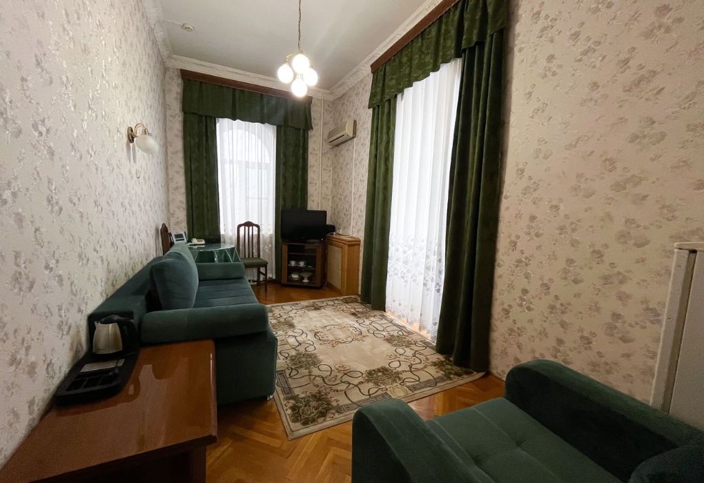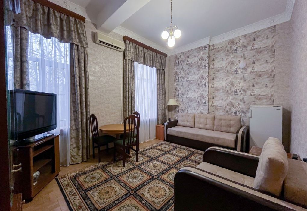 Люкс двухместный двухкомнатный в корпусе 7 (Л2м2к7) Площадь номера: 60 м2 Услуги и удобства: Туалет, Ванна, Туалетные принадлежности, Полотенца, Отопление, Телевизор, Холодильник, Электрический чайник, Фен, Сейф, Телефон, Шкаф/гардероб, Платный проводной интернет, Вид на город Тип кровати/ей: 2 односпальные кровати Дополнительные места: Раскладная кроватьУслуги и удобства