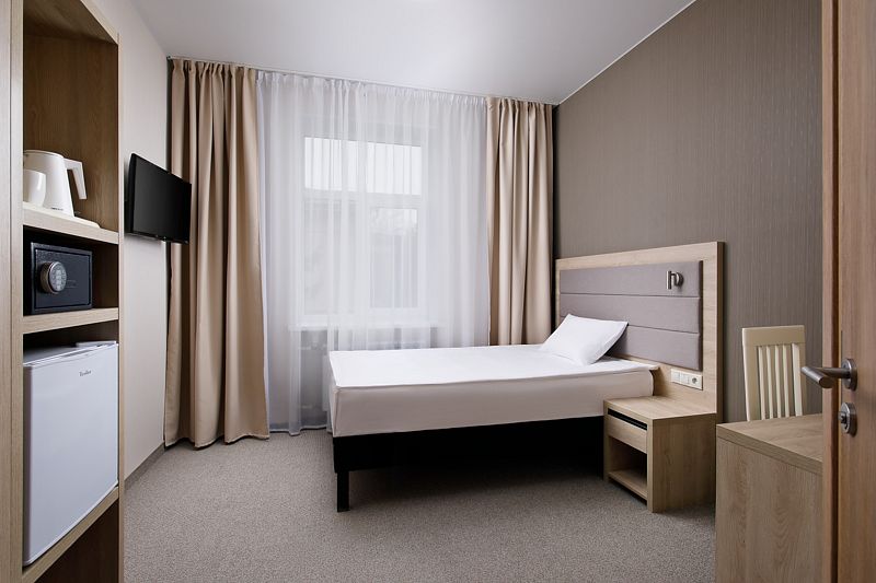 Одноместный номер небольшой по площади с односпальной кроватью, ванной комнатой и душевой кабиной. Данные номера расположены на нулевом этаже.