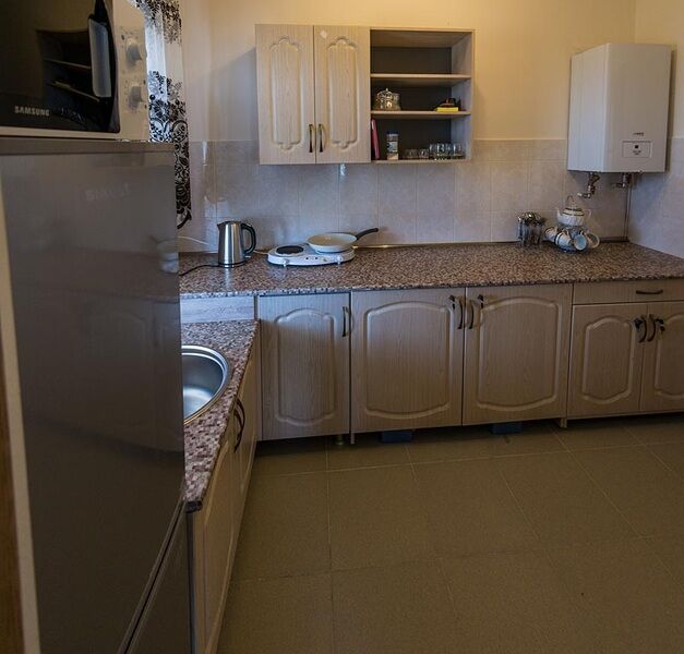 - Кухня: холодильник, плита, чайник, микроволновка, посуда, мойка, сковорода;