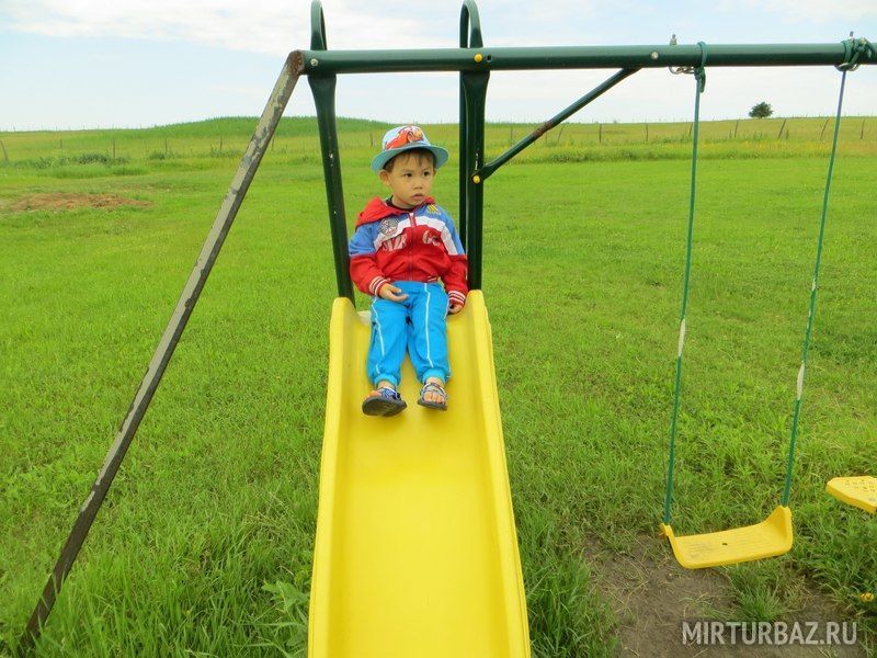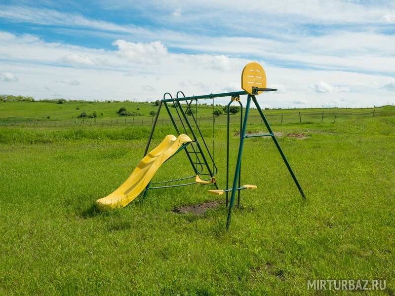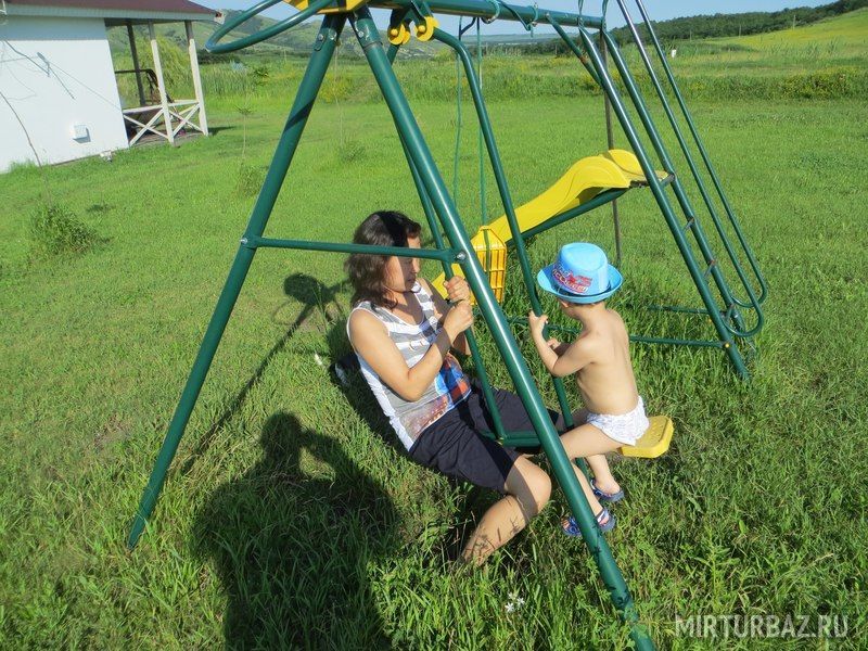 Для детей установлена небольшая, но интересная детская площадка с горкой и качелями.