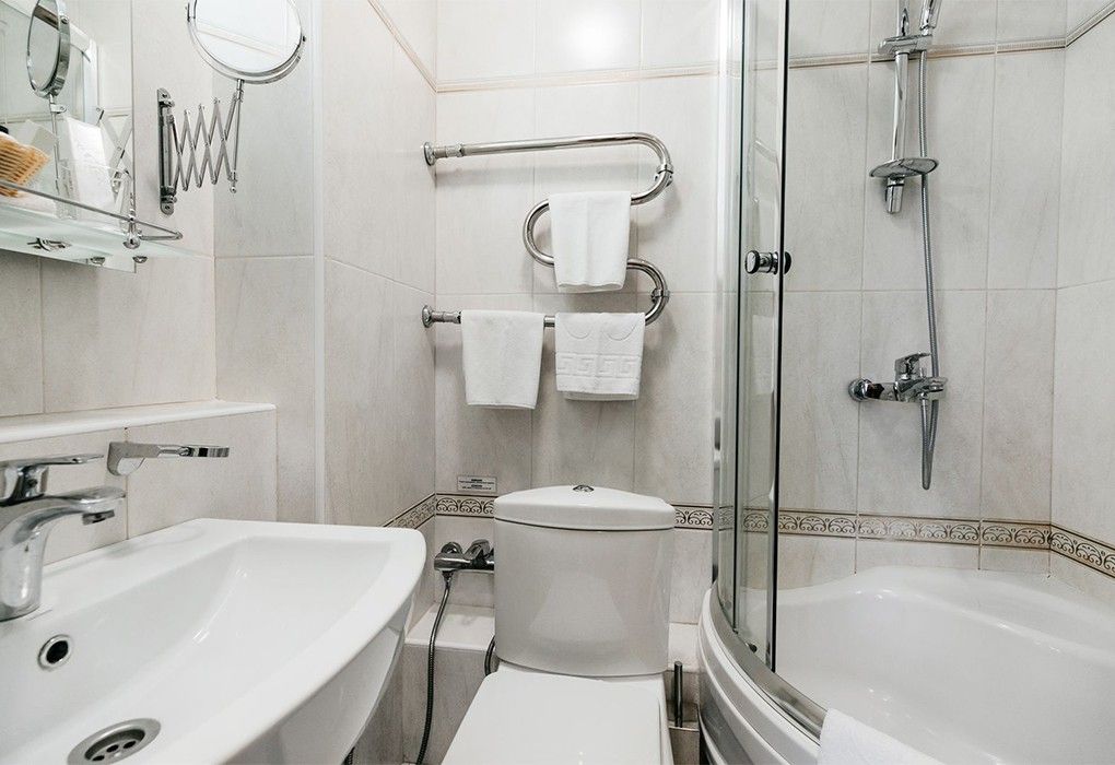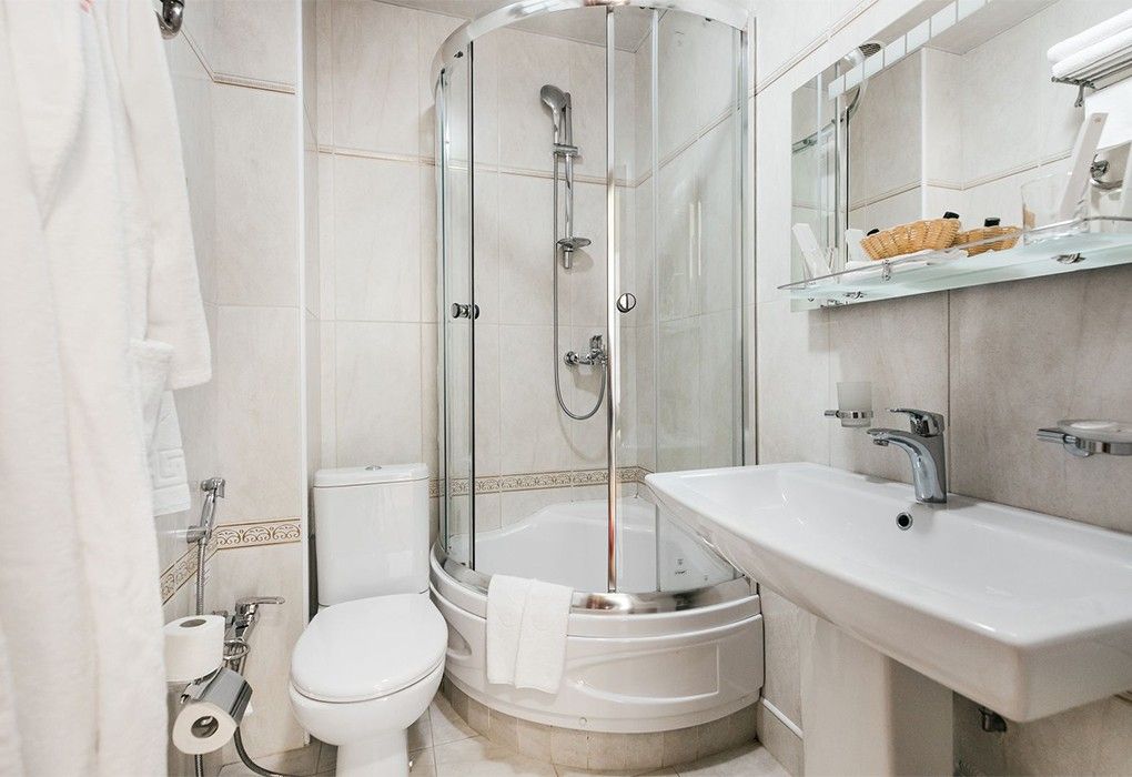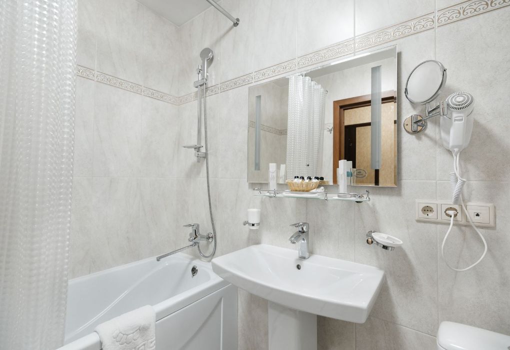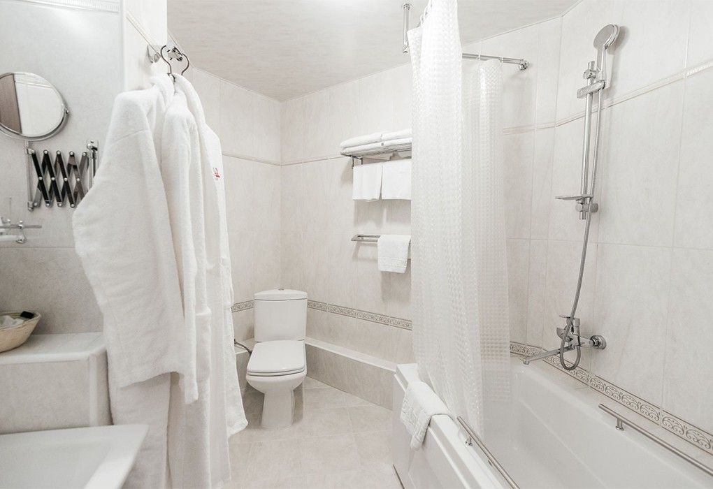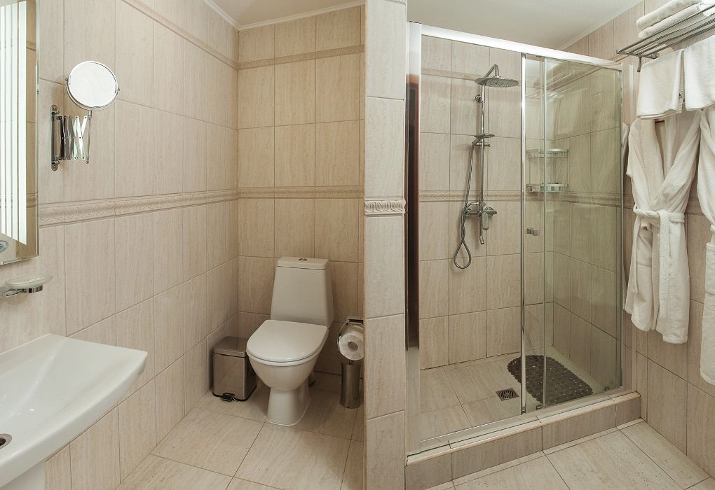 душевая кабина, биде, фен, косметическое зеркало, халаты, тапочки, набор полотенец, набор элитной косметики «Аква», холодильник, электрочайник, набор посуды для минибара, сейф, телевизор