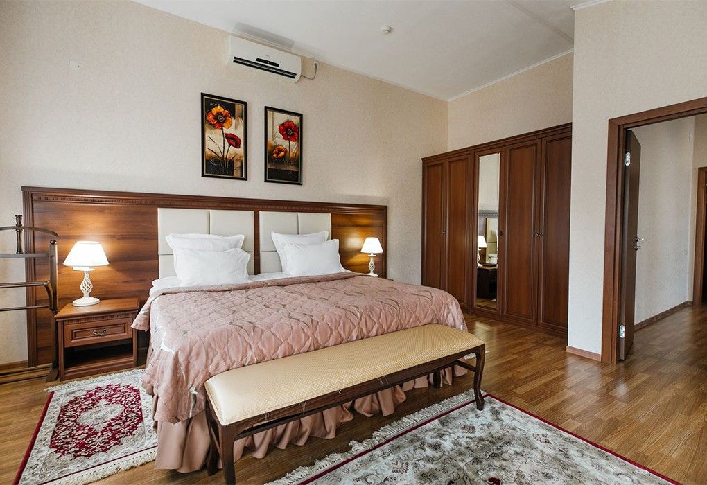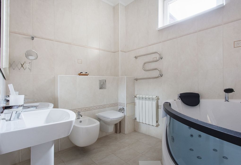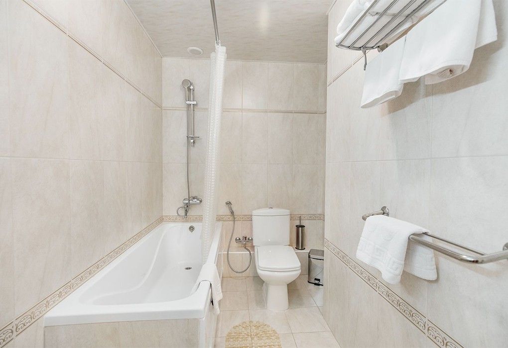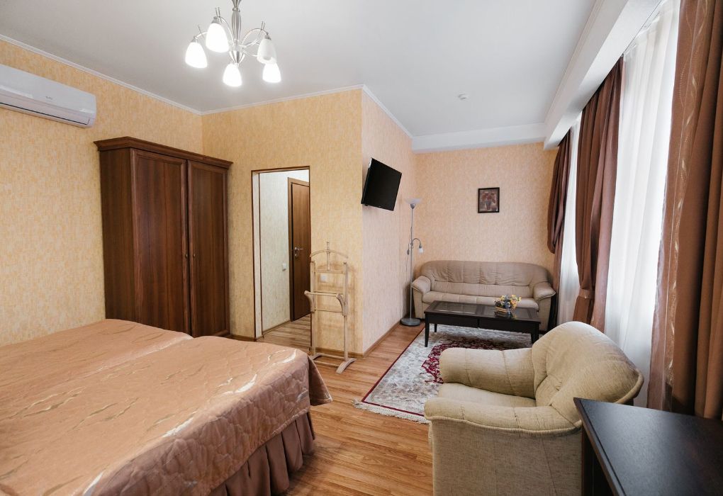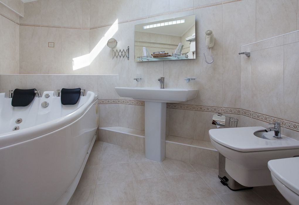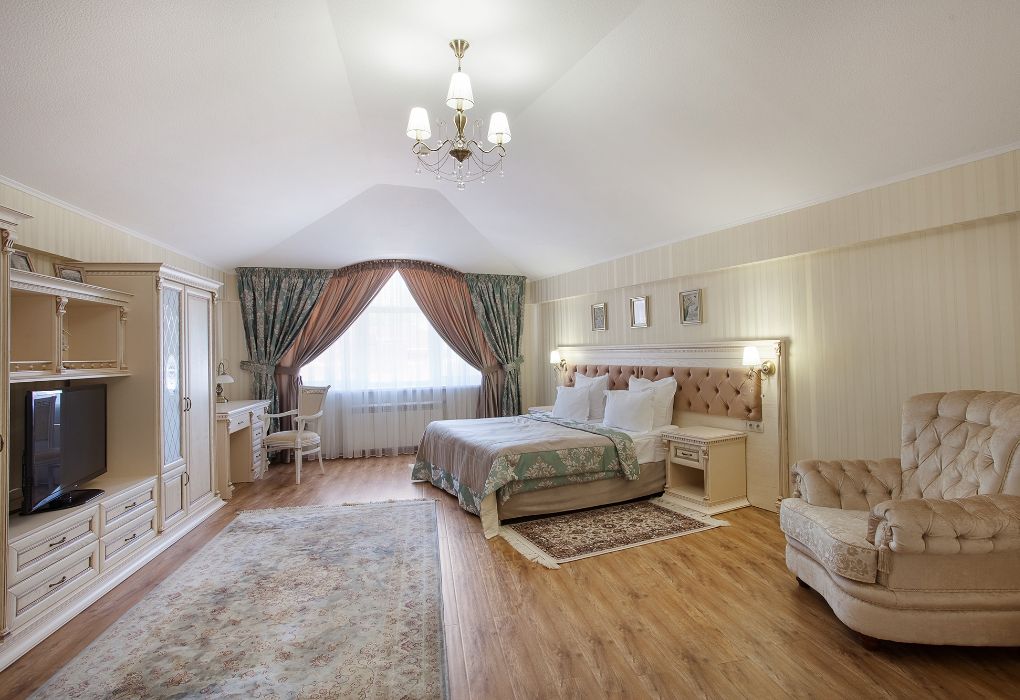 душевая кабина, биде, фен, косметическое зеркало, халаты, тапочки, набор полотенец, набор элитной косметики «Аква», холодильник, электрочайник, набор посуды для минибара, сейф, телевизор