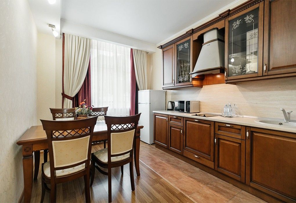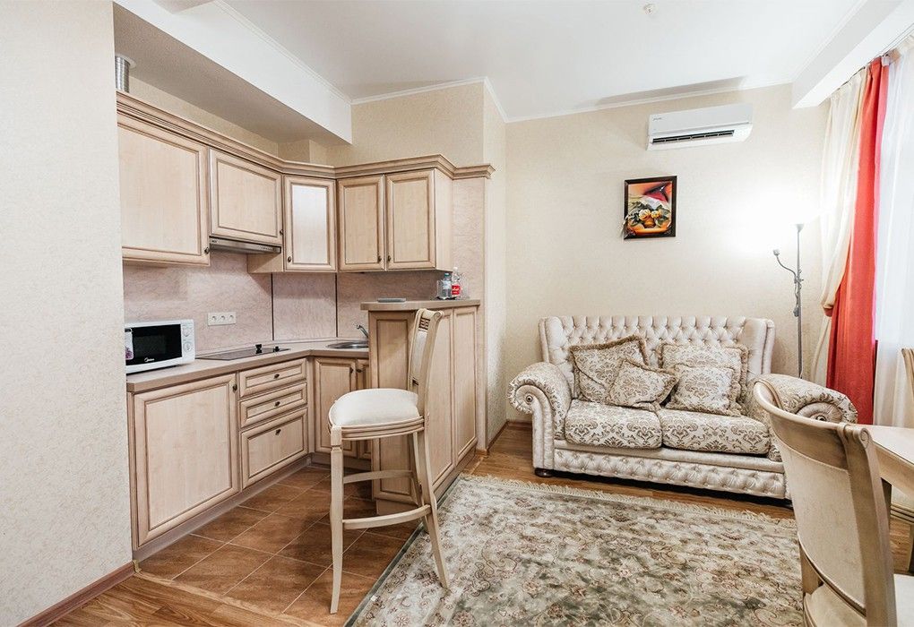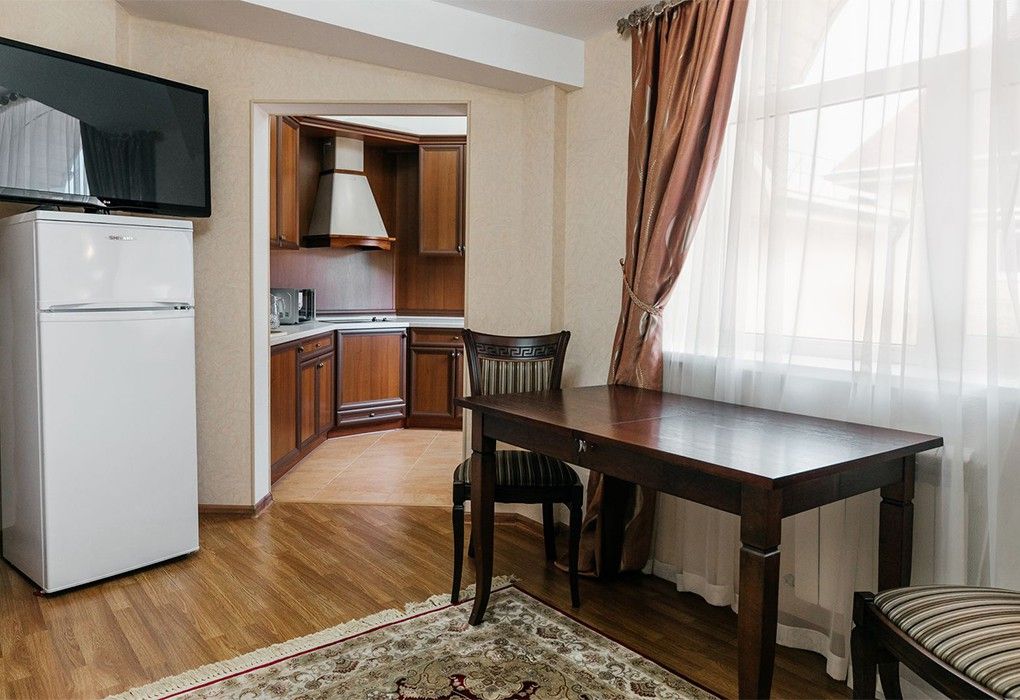 душевая кабина, биде, фен, косметическое зеркало, халаты, тапочки, набор полотенец, набор элитной косметики «Аква», холодильник, электрочайник, набор посуды для минибара, сейф, телевизор, кондиционер, электроплита