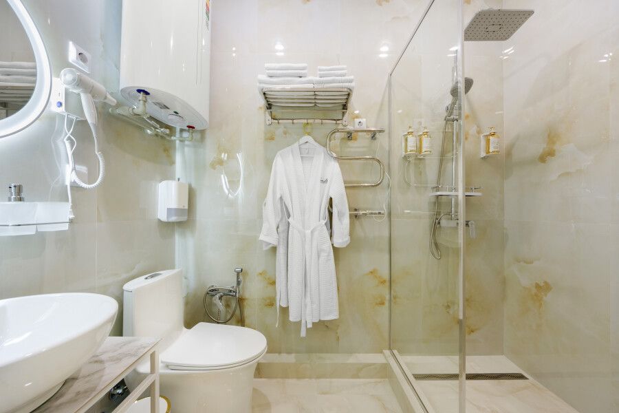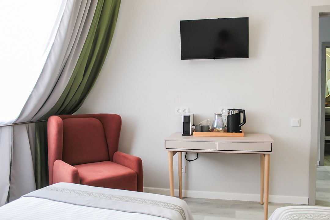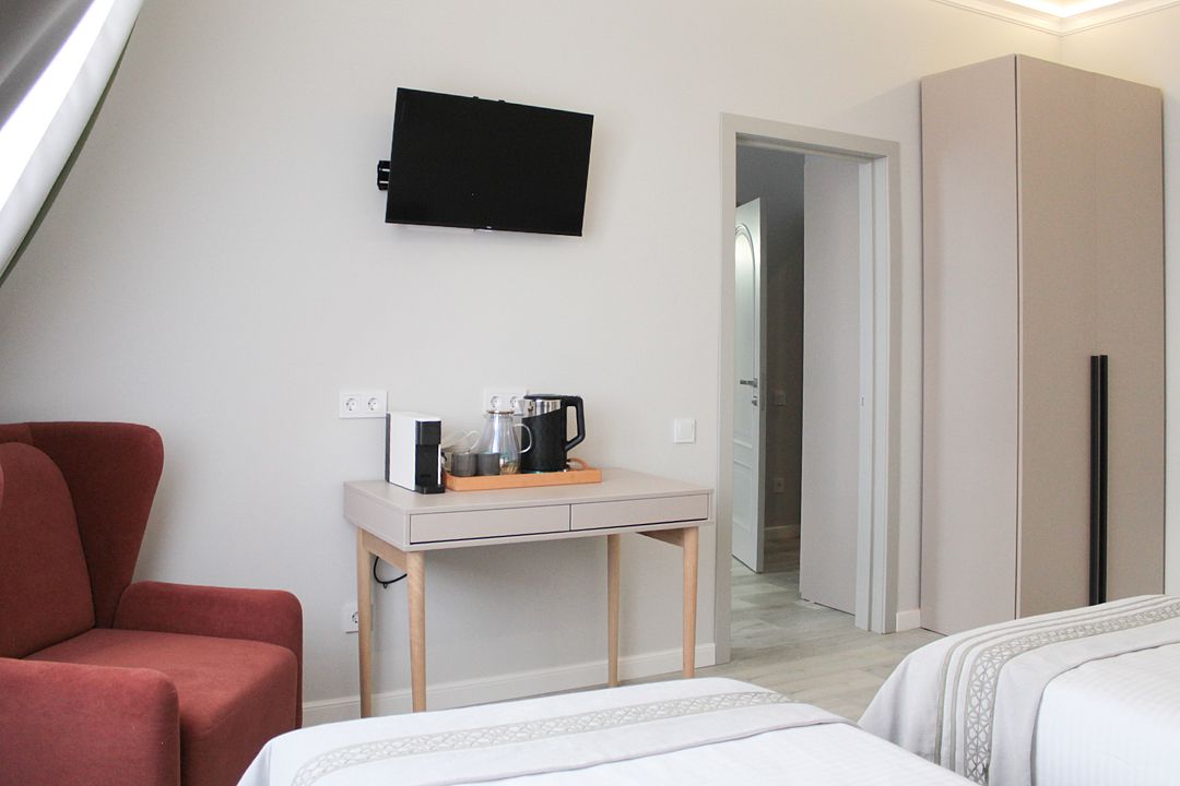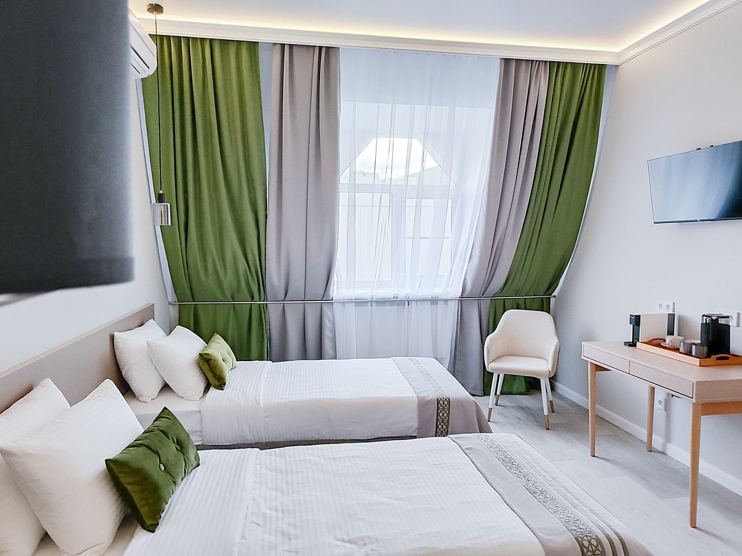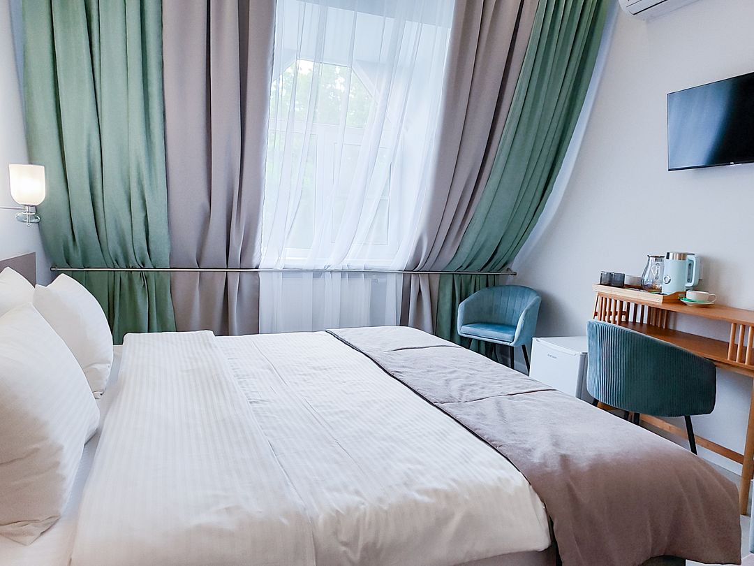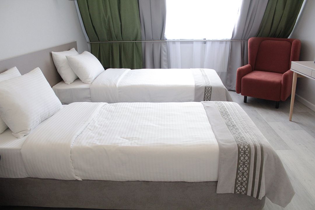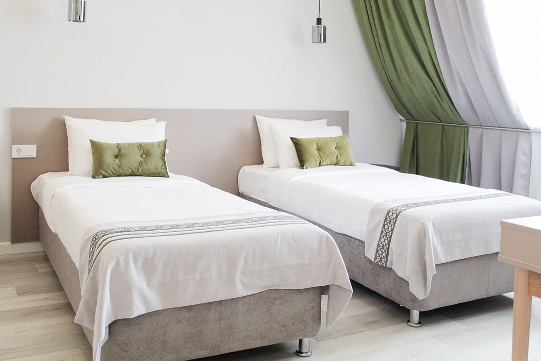Двухместный номер стандарт – красивый, уютный номер. Номер подходит для одноместного или двухместного размещения. Номер оснащен всем необходимым оборудованием и мебелью. Есть возможность организации дополнительного спального места. По запросу выдаются халаты.