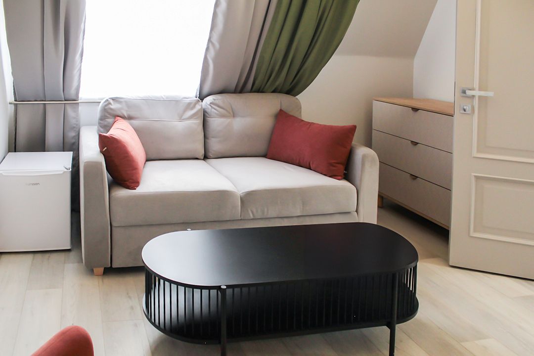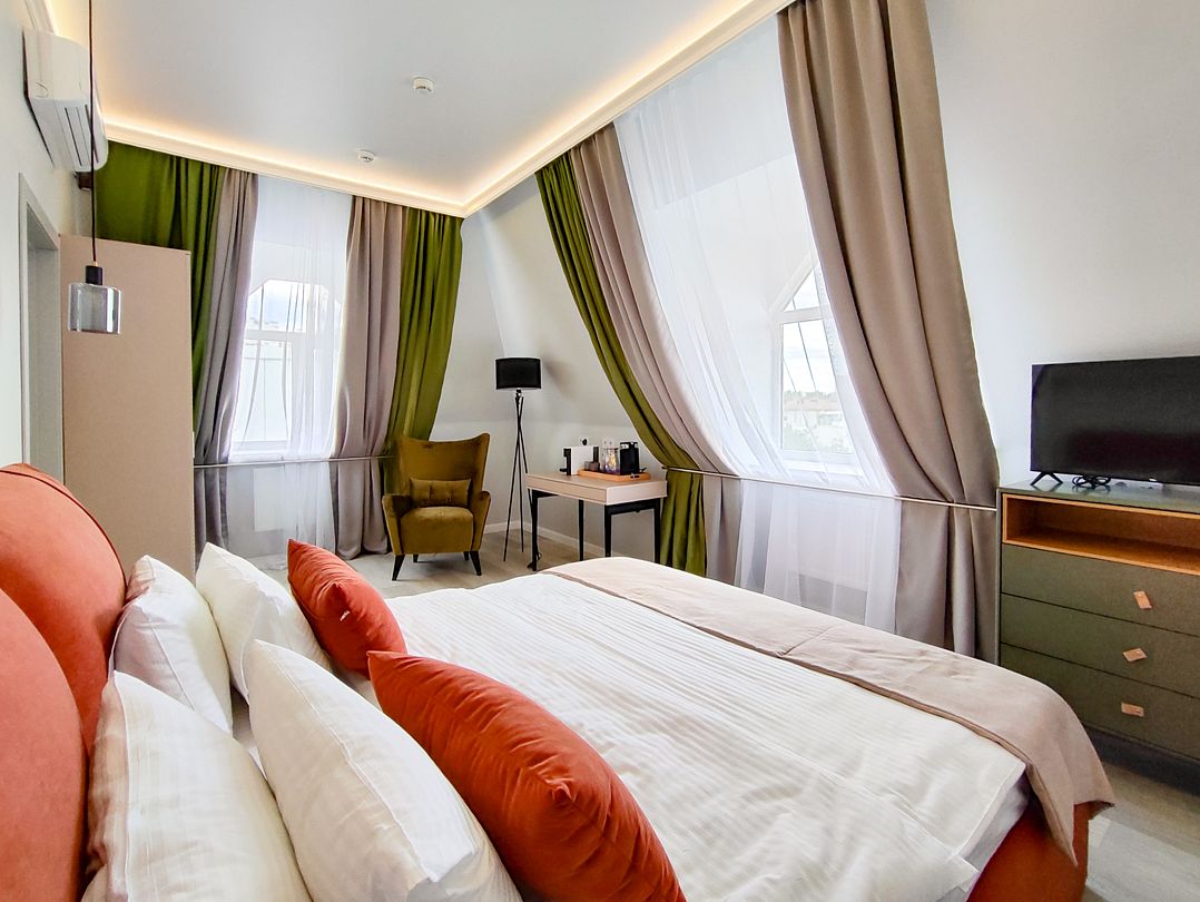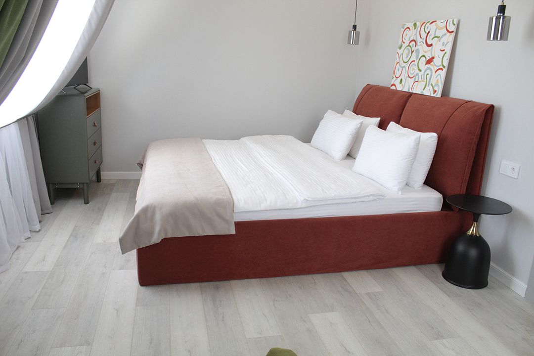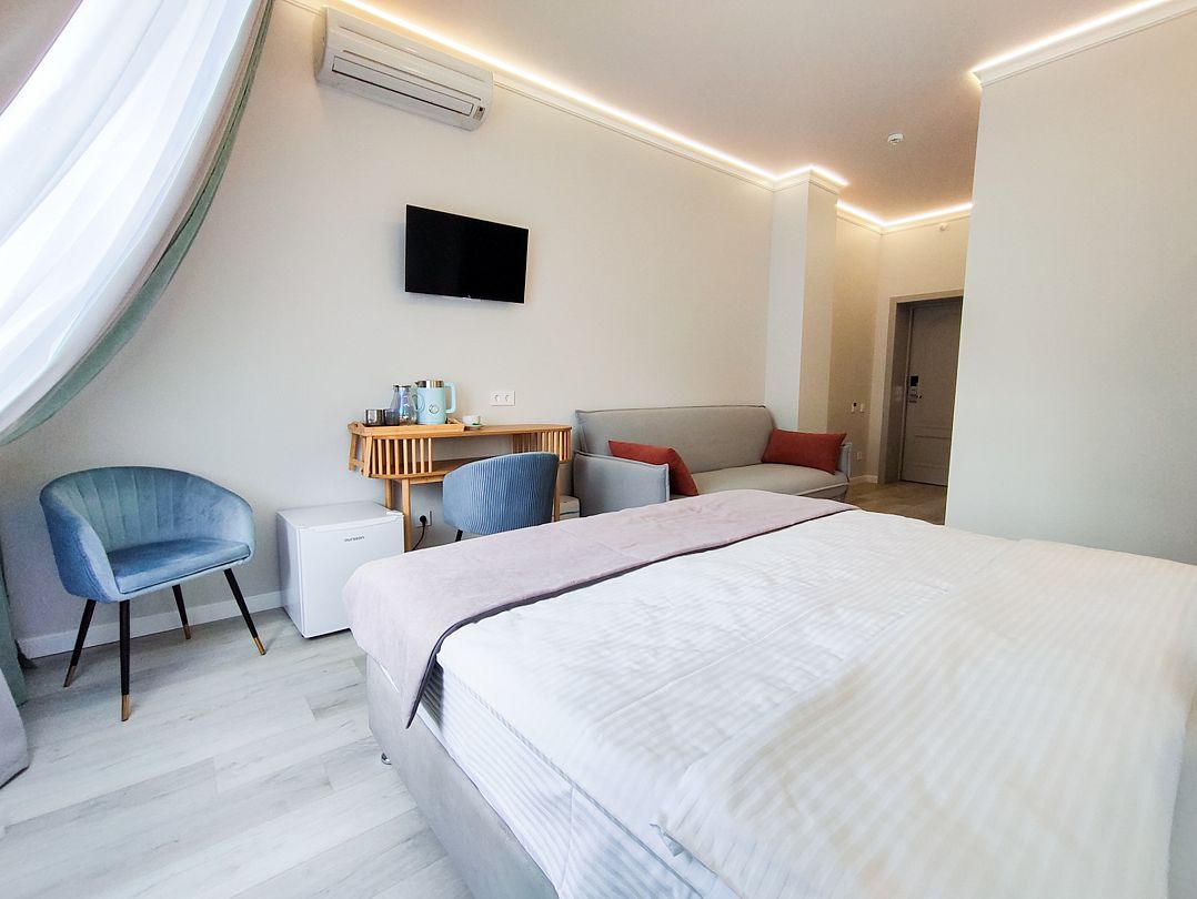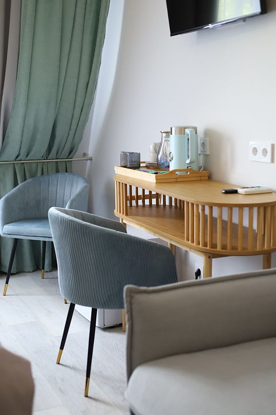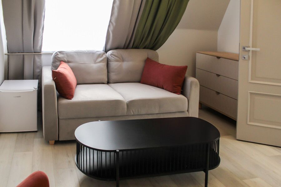 Светлый и просторный двухкомнатный номер с деревянной мебелью и панорамными мансардными окнами. В гостиной можно комфортно провести время за чашкой чая, а в спальне – насладиться крепким сном на удобной кровати с ортопедическим матрасом. Лаконичный дизайн, функциональное пространство и душевая кабина с тропическим душем делают этот номер идеальным для тех, кто ценит уют и практичность. Чтобы отдых стал ещё приятнее, рекомендуем посетить наш SPA с широким выбором расслабляющих процедур.