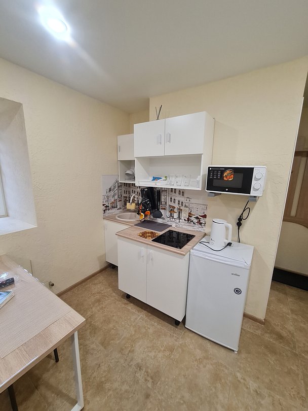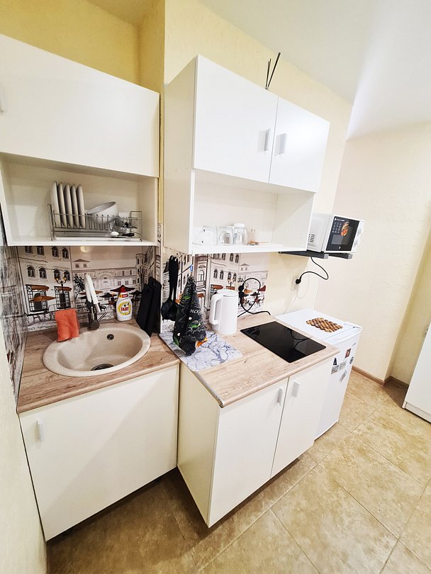 Кухня оборудована всем необходимым для самостоятельного приготовления пищи: посуда, сковородки, кастрюли, столовые приборы, чайные стаканы и тарелки. Также в номере есть микроволновая печь, чайник, индукционная плита и холодильник.