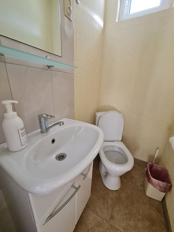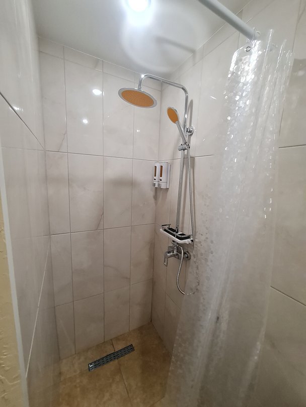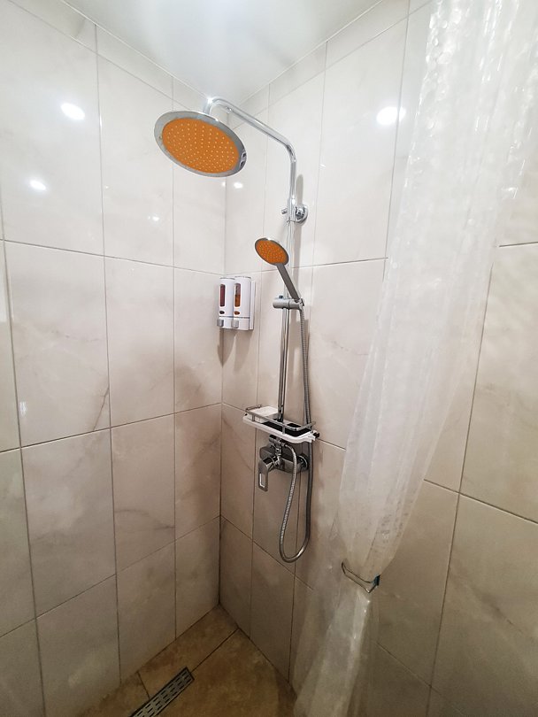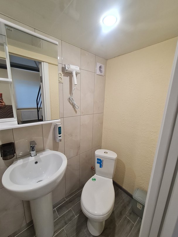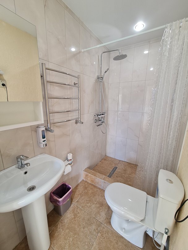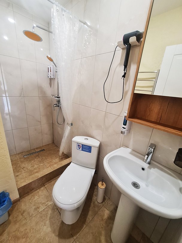 Санузел оборудован душевой кабиной, мягким теплом фен ласково высушит волосы, гигиенические средства обеспечат чистоту и порядок.