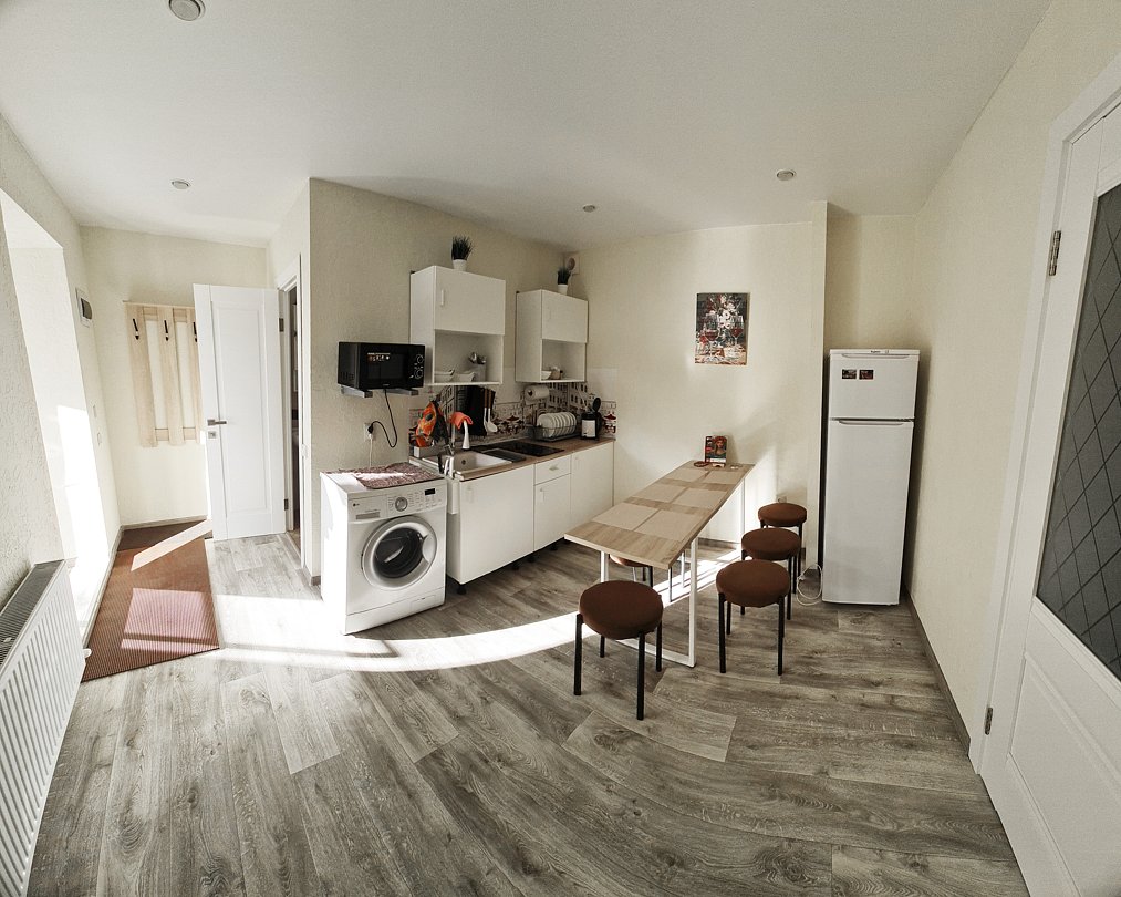 На кухне есть вся необходимая техника и посуда — холодильник, плита, микроволновая печь, позволяющие приготовить аппетитные блюда и сохранить продукты свежими. Санузел оснащён удобным душем, феном и предметами личной гигиены, дарящими ощущения свежести и чистоты каждый день.