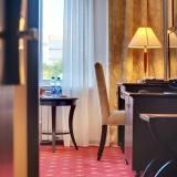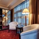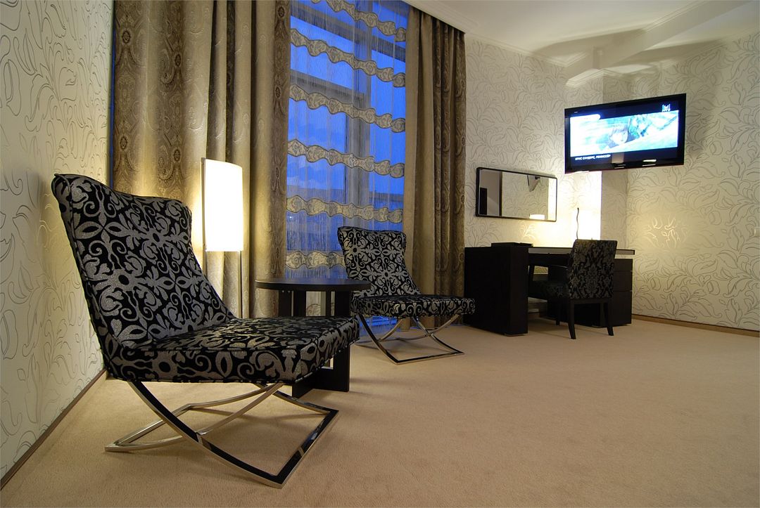 Wi-Fi, кондиционер, светильник, фен, система безопасности, электронные замки, ванная комната, душевая кабина, санузел, банные принадлежности, халаты, банные полотенца, тапочки, косметические средства, кровать «King size», диван, кресла, шкаф для одежды, вешалки, эксклюзивная мебель, чайный набор, сейф, минеральная вода, чайник, унитаз, раковина, питьевая вода, ковровое покрытие, отопление, душ, вид на город, кулер на этаже, высокие потолки, тумба, туалетные средства, туалет, цифровое тв, внутренний телефон, телевизор с плоским экраном, мини-холодильник, рабочий стол, услуги прачечной (платно), бутилированная водаВ гостиничном номере