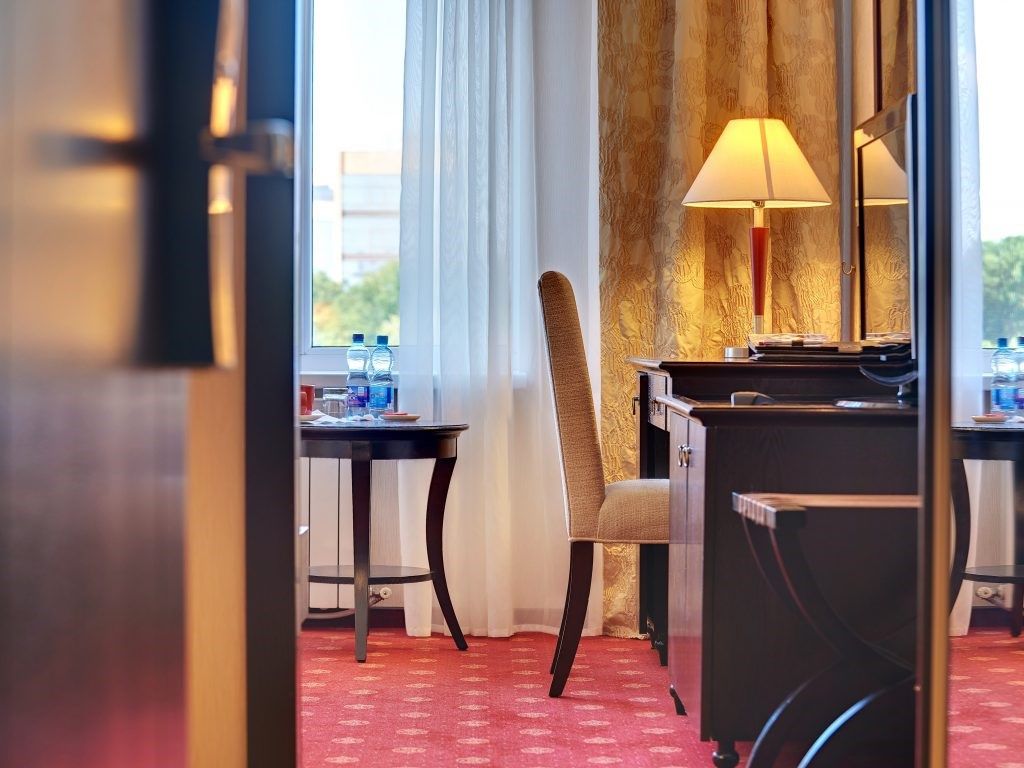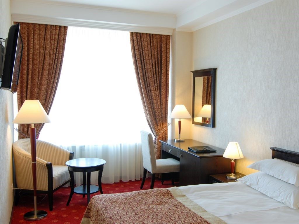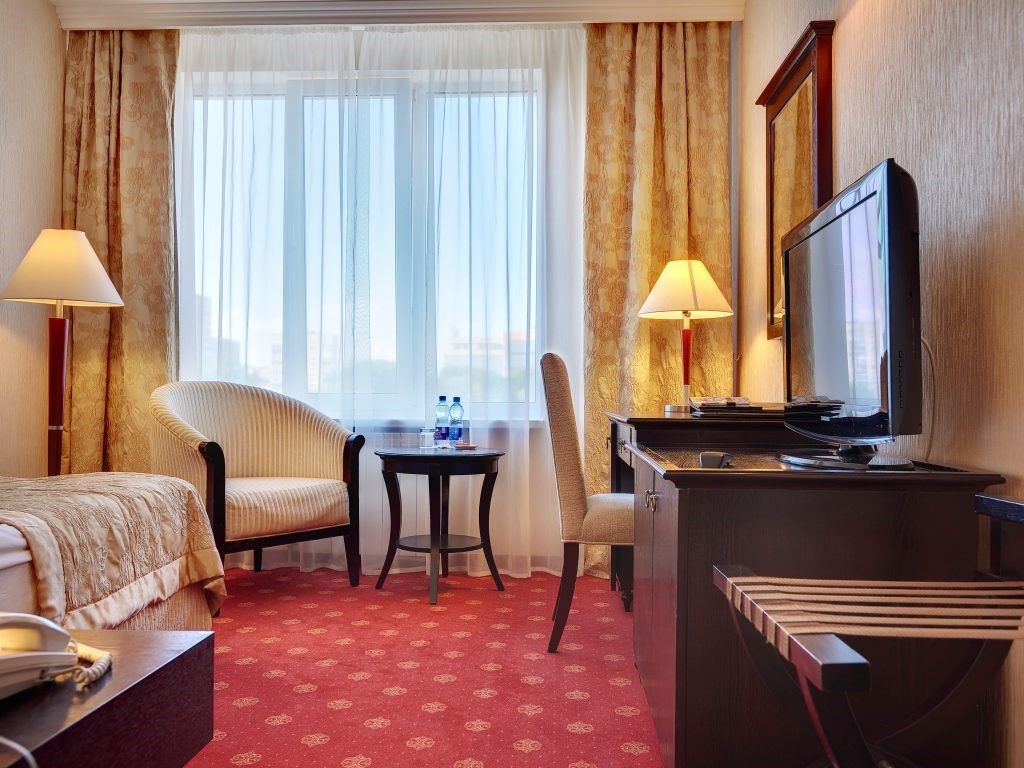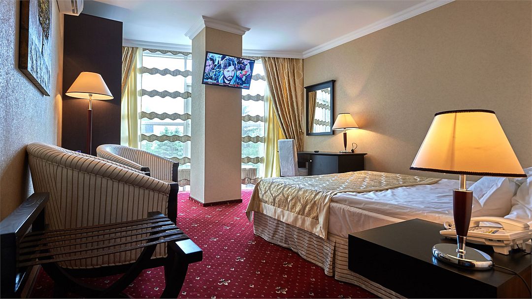 телевизор, Wi-Fi, холодильник, кондиционер, светильник, фен, система безопасности, электронные замки, ванная комната, ванна, санузел, халаты, банные полотенца, тапочки, гигиенические средства, косметические средства, кровать «King size», кресла, шкаф для одежды, вешалки, журнальный столик, багажная тумба, эксклюзивная мебель, чайный набор, сейф, минеральная вода, чайник, унитаз, раковина, питьевая вода, ковровое покрытие, отопление, вид на город, кулер на этаже, высокие потолки, тумба, туалетные средства, туалет, панорамные окна, цифровое тв, внутренний телефон, телевизор с плоским экраном, мини-холодильник, рабочий стол, набор для приготовления чая и кофе, услуги прачечной (платно), вешалки-плечики, бутилированная вода, мыло, затемняющая штораВ гостиничном номере