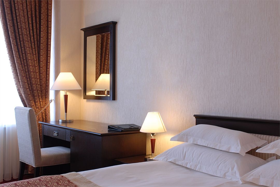 Wi-Fi, кондиционер, настольные лампы, фен, система безопасности, электронные замки, ванная комната, душевая кабина, санузел, банные принадлежности, халаты, банные полотенца, тапочки, косметические средства, двуспальная кровать, тумбы, стулья, шкаф для одежды, вешалки, багажная тумба, чайный набор, сейф, минеральная вода, чайник, унитаз, раковина, питьевая вода, ковровое покрытие, отопление, душ, вид на город, кулер на этаже, вид во двор, высокие потолки, тумба, туалетные средства, туалет, цифровое тв, внутренний телефон, телевизор с плоским экраном, мини-холодильник, рабочий стол, набор для приготовления чая и кофе, услуги прачечной (платно), бутилированная вода, мыло, затемняющая штораВ гостиничном номере