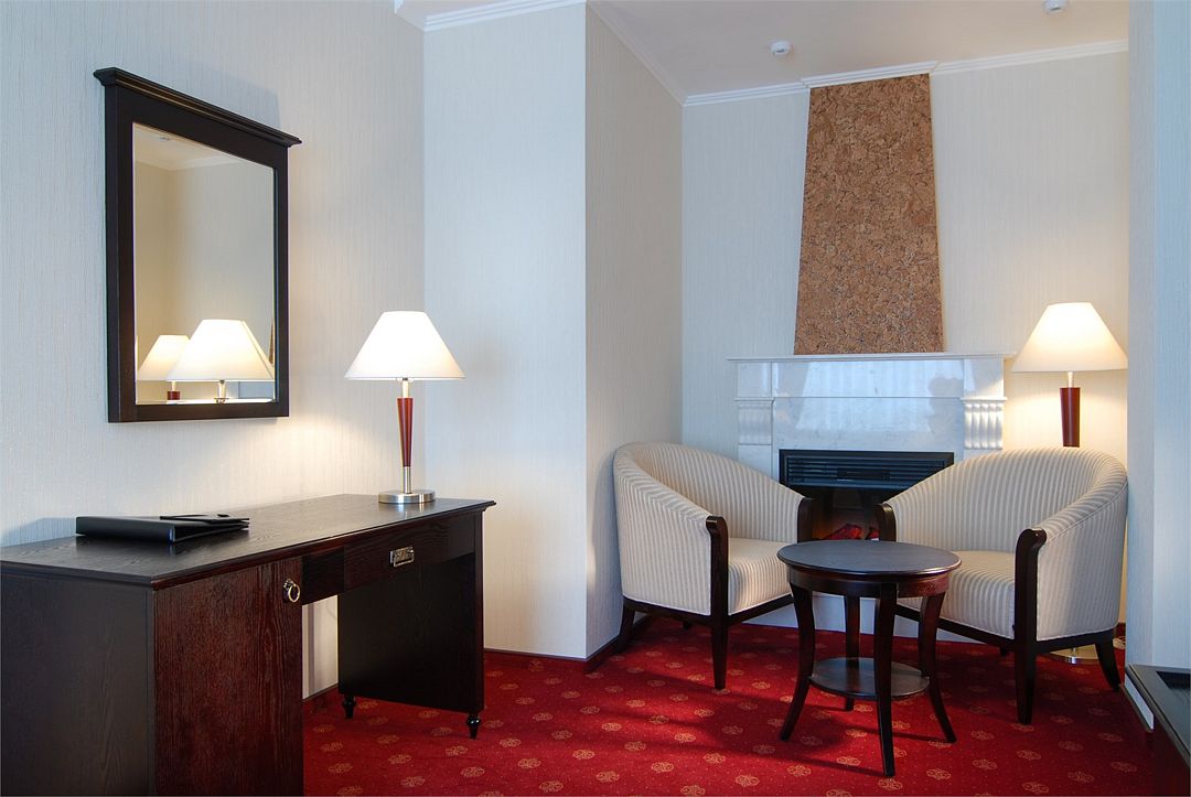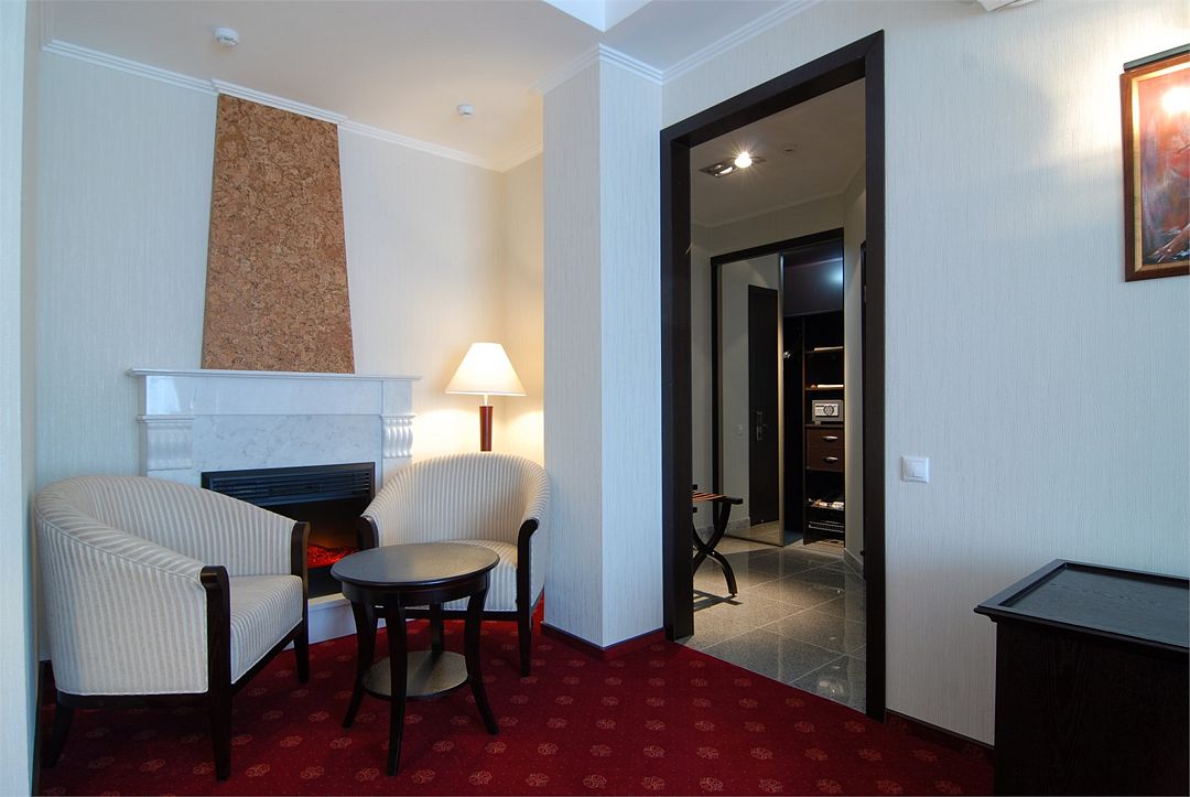 телевизор, Wi-Fi, холодильник, кондиционер, светильник, настольные лампы, фен, система безопасности, электронные замки, ванная комната, ванна, санузел, биде, банные принадлежности, халаты, банные полотенца, тапочки, кровать «Queen size», кресла, шкаф для одежды, вешалки, письменный стол, зеркало, ковер, камин, чайный набор, минеральная вода, чайник, унитаз, раковина, питьевая вода, ковровое покрытие, отопление, душ, вид на город, кулер на этаже, высокие потолки, туалетные средства, туалет, цифровое тв, внутренний телефон, телевизор с плоским экраном, рабочий стол, набор для приготовления чая и кофе, услуги прачечной (платно), мыло, затемняющая штораВ гостиничном номере