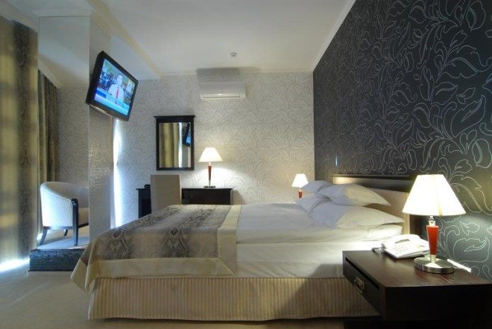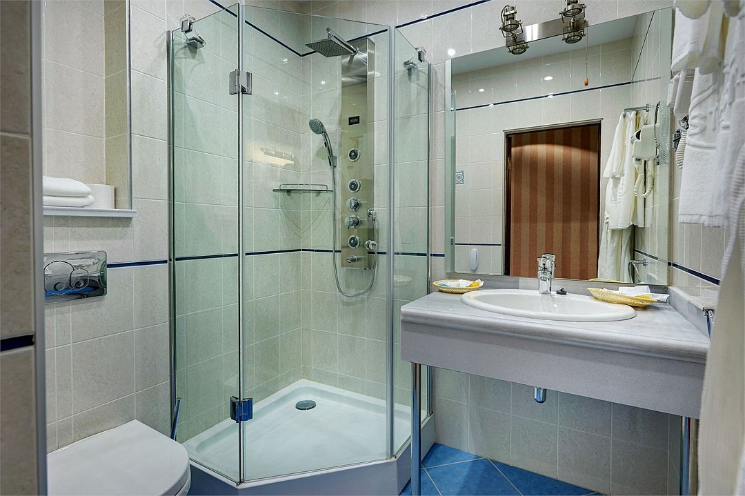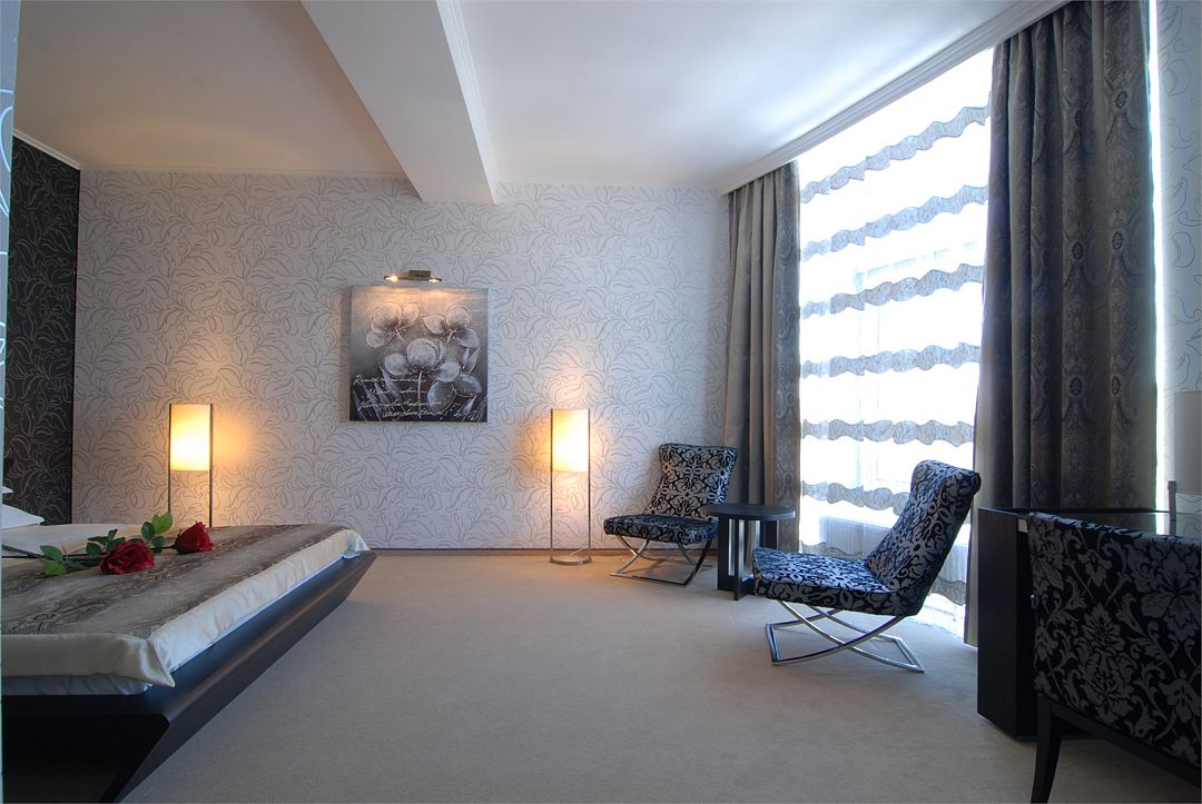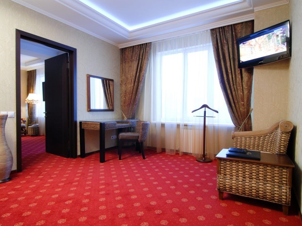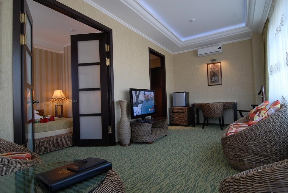 Wi-Fi, кондиционер, светильник, фен, система безопасности, электронные замки, ванная комната, душевая кабина, санузел, банные принадлежности, халаты, банные полотенца, тапочки, косметические средства, кровать «King size», диван, тумбы, шкаф для одежды, вешалки, багажная тумба, эксклюзивная мебель, две комнаты, чайный набор, минеральная вода, чайник, унитаз, раковина, питьевая вода, гостиная зона, ковровое покрытие, отопление, душ, вид на город, кулер на этаже, вид во двор, высокие потолки, стол, тумба, туалетные средства, туалет, цифровое тв, внутренний телефон, телевизор с плоским экраном, мини-холодильник, рабочий стол, набор для приготовления чая и кофе, услуги прачечной (платно), бутилированная вода, мыло, затемняющая штораВ гостиничном номере