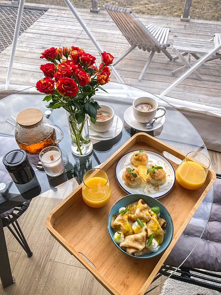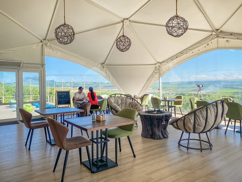 В ресторане готовят очень вкусно, большой выбор разнообразных блюд, завтраки приносят в купол. У каждого купола есть своя терраса с креслами, где можно проводить время, в тишине и уединении с самим собой, любуясь красивой природой под пение птиц. В куполах ВИП+ плюсом есть массажное кресло и купель с аэромассажем. Обязательно вернусь, рекомендую ВСЕМ!!!