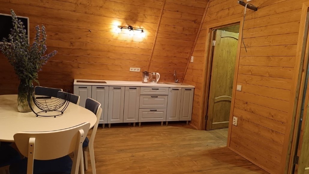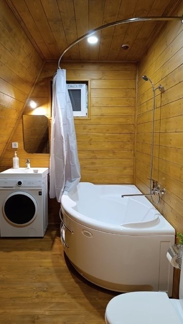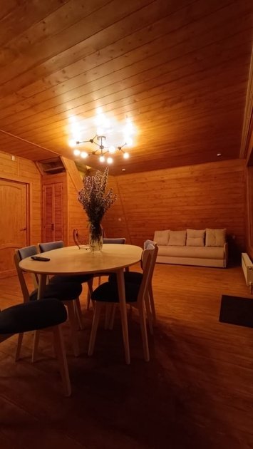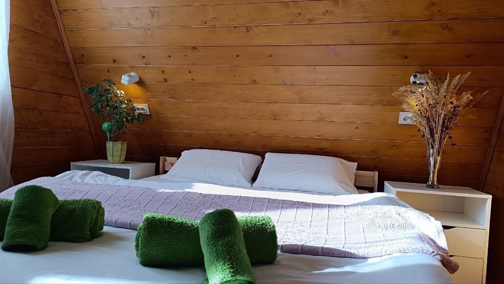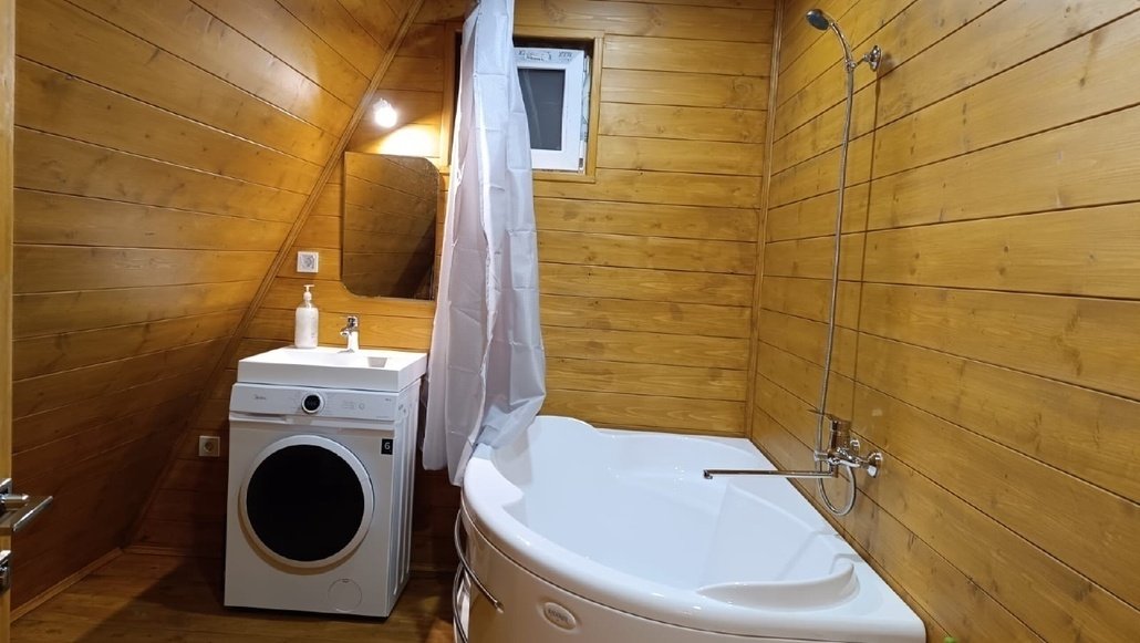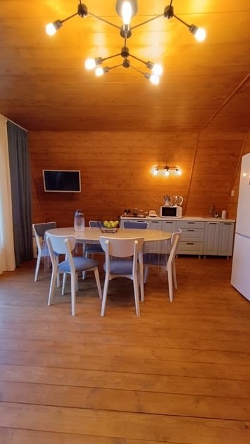 На мансардном этаже двуспальный матрас. Есть просторная терраса со стульчиками. Во дворе мангальная зона и уличный стол со скамейками. Имеются «дежурные» шампура, но лучше брать свои. Угли и дрова не предоставляем.