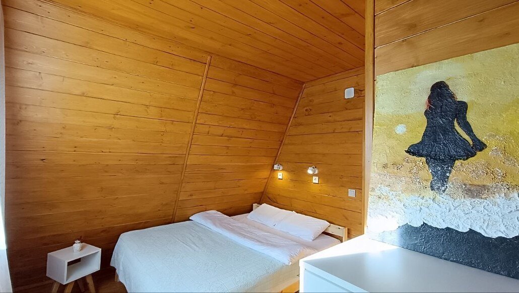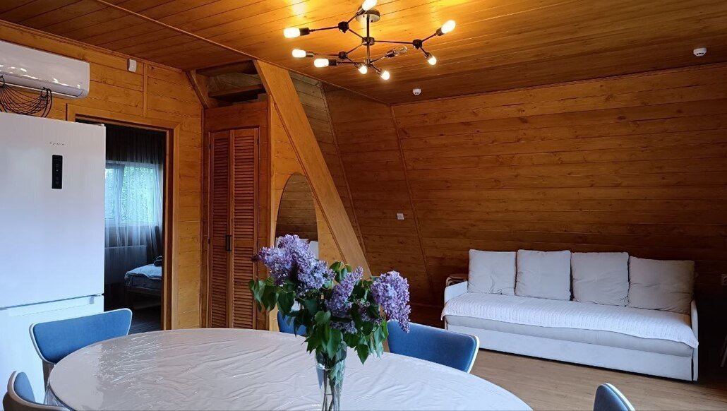 «Тот самый дом» представляет собой уникальное двухэтажное здание в стиле А-фрейм с мансардой, расположенное в живописном районе с захватывающим видом на гору Бештау. На первом этаже находятся спальня с двуспальной кроватью и диваном, современная кухня-гостиная и ванная комната с полноценной ванной. Второй этаж включает еще одну спальню с отдельным санузлом и зону отдыха с панорамным видом на горный массив, а на мансарде установлен двуспальный матрас.