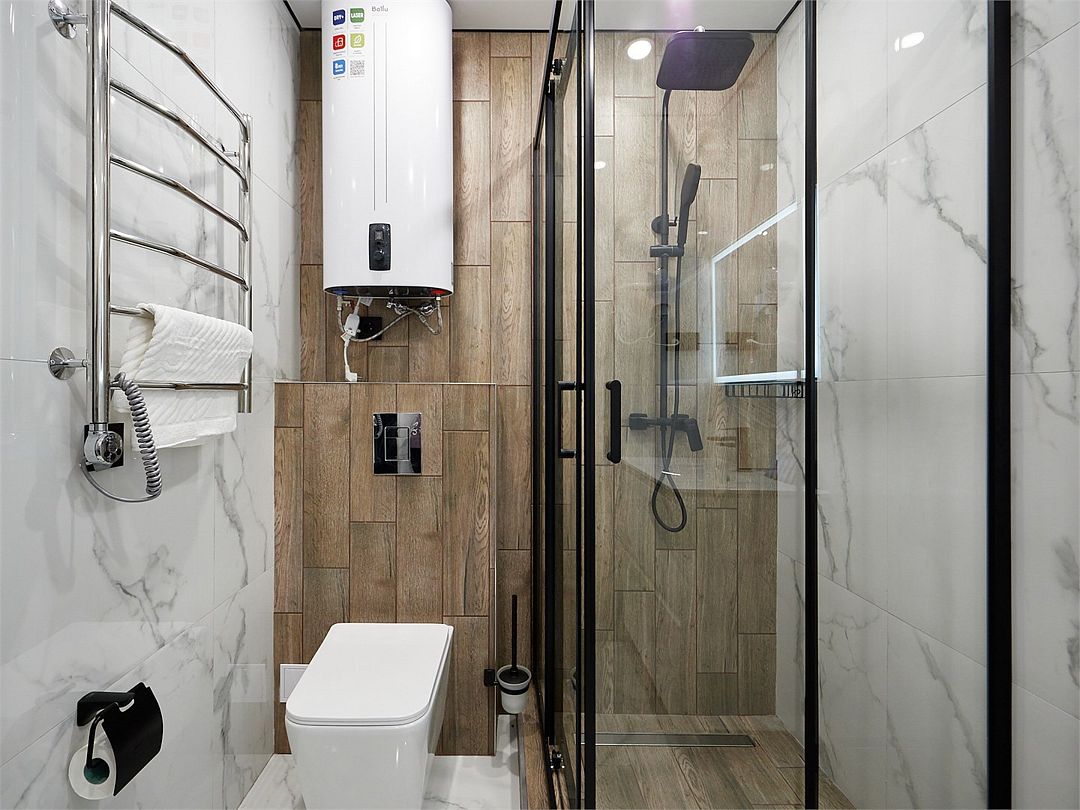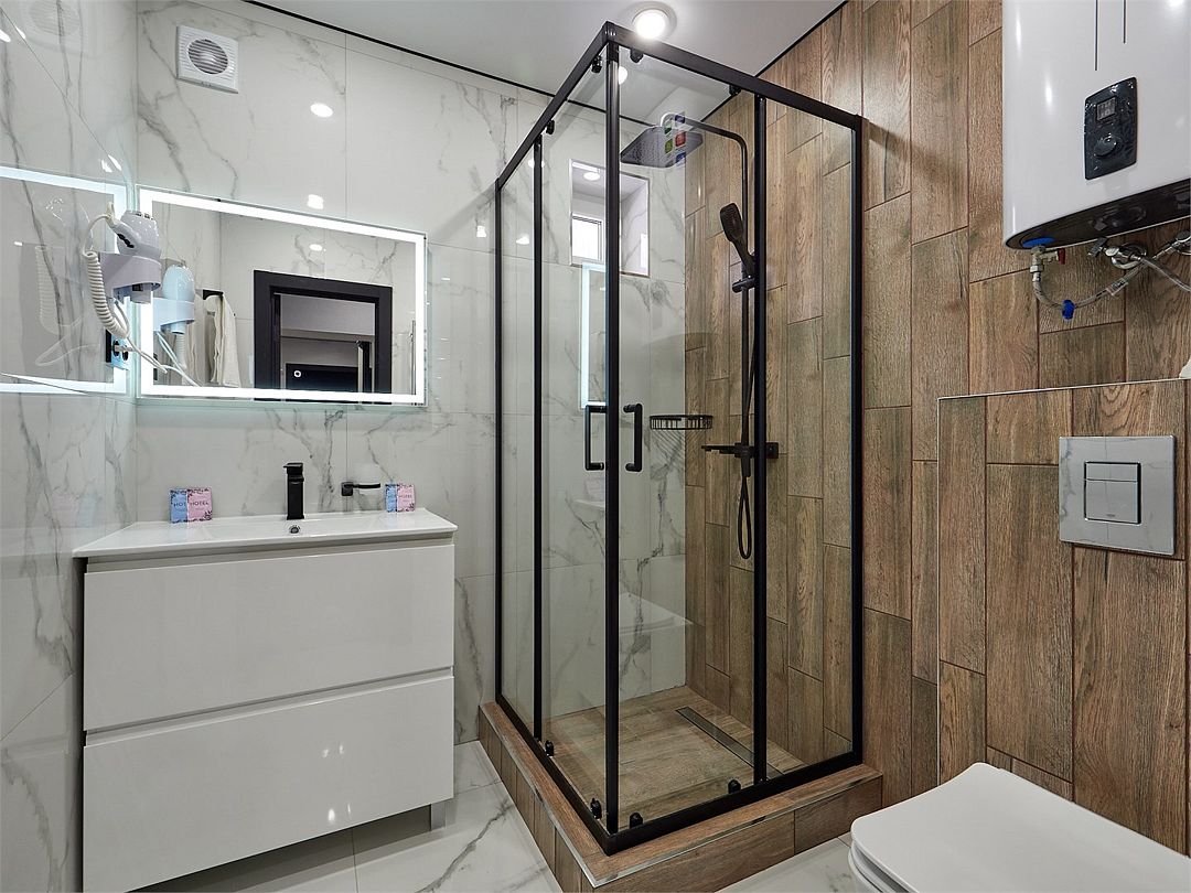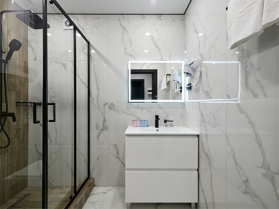 Ванная комната: оснащенная всеми необходимыми аксессуарами и косметическими средствами, душевая кабинка, фен, тапочки.