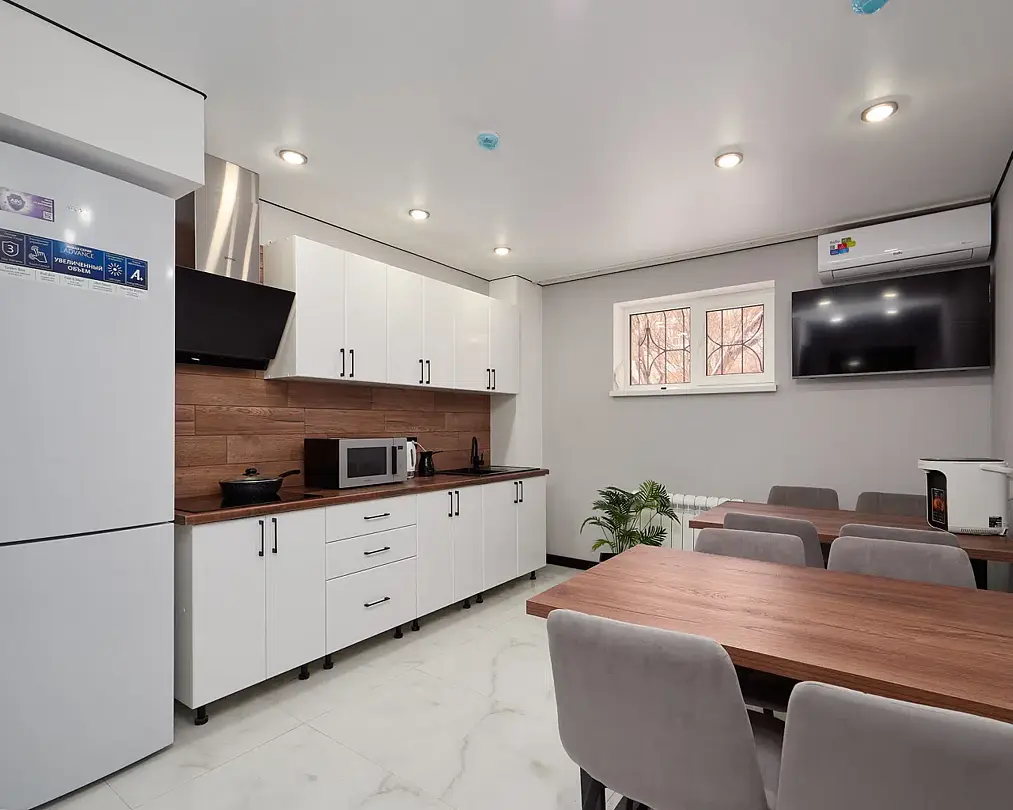 Оборудование: телевизор с большим экраном, мини-холодильник, чайник, набор посуды, удобные шкафы для хранения вещей.